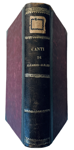 In 8°; (4 comprese occhiello), XXXVIII, 495, (1) pp. 3 due c. di tav. una delle quali più volte ripiegate. Bella legatura coeva in mezza-pelle scura con titolo e ricchi fregi in oro al dorso. Tagli marmorizzati. Esemplare in ottime condizioni di conservazione. Una delle due tavole, quella in antiporta, contiene una bella fotografia coeva di Aleardo Aleardi scattata dallo stabilimento fotografico veneziano di A. Perini. L'opera contiene alcuni componimenti in prima edizione oltre ad una riproduzione di un autografo del noto del celebre poeta e uomo politico veronese, Aleardo Aleardi (Verona, 14 novembre 1812 - Verona, 17 luglio 1878). Nel 1848 venne inviato a Parigi da Manin per chiedere aiuti per la Repubblica Veneta. Nel 1852 venne arrestato, una prima volta, e rinchiuso per qualche mese nella fortezza di Mantova e una seconda volta, nel 1859 nel castello di Josephstadt, in Boemia, in conseguenza della guerra austro-franco-piemontese. Nel 1860 fu deputato nel Regno di Sardegna e poi nel nasciuturo Regno d'Italia dove venne anche eletto Senatore nel 1873. Benedetto Croce lo definì poeta della transazione romantica, incerto tra classicismo e realismo. Ottimo esemplare.