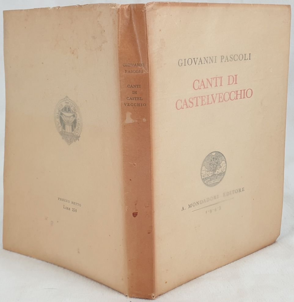 Edizione del 1945 di questa opera del poeta italiano Giovanni Pascoli (1885-1912) "Canti di Castelvecchio". Le poesie in questa raccolta riportano cenni biografici e hanno come tema la campagna.<BR>Timbro a secco. In ottime condizioni, presente perfino foglietto pubblicitario della Mondadori.<BR>Copertina editoriale con carta protettiva in buone condizioni generali con lievi usure ai margini e dorso. Legatura in buone condizioni. Pagine in ottime condizioni con rare fioriture. In 8. Dim. 24x17 cm. Pp. XIV+(4)+254+(4).Edition of 1945 of this work by the italian poet Giovanni Pascoli (1885-1912) "Canti di Castelvecchio". The poems in this collectionare about countryard and contains biographycal information.<BR>Embossed stamp. In very good conditions there is even the advertising page of Mondadori. Editorial cover with protective paper in good general conditions lightly worn in the extremities. Binding in good conditions. Inside pages are in very good conditions with occasional foxings. In 8. Dim. 24x17 cm. Pp. XIV+(4)+254+(4).