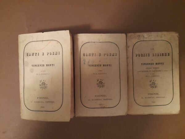 Volumi (3) in 32°. Brossura editoriale con copertina leggera.Titoli e autore sul piatto e sul dorso. Sul dorso in alto a penna numero sequenziale di biblioteca privata. Pagine 506 + 558 + 559. Nel controfrontespizio del primo volume, ritratto di Vincenzo Monti in litografia. Buone condizioni, integri. COMPLETO