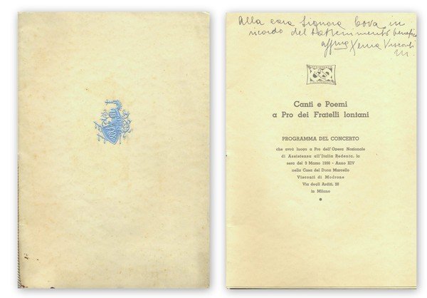 In 8°, br. edit., pp. 8; contiene il programma del concerto tenutosi nella Casa del Duca Marcello Visconti di Modrone a Milano il 3 Marzo 1936; invio alla prima pag. di Zegna Visconte Modrone; ottimo es.