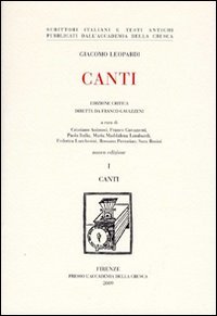 Il primo tomo contiene l'edizione dei "Canti", con la documentazione della genesi ed evoluzione dell'ultima edizione progettata da Leopardi, sulla quale apportò le ultime correzioni e inserì gli ultimi celebri testi, la "Ginestra" e il "Tramonto della Luna". Il secondo tomo accoglie tutte le prose autografe e a stampa che a vario titolo sono legate alla storia dei "Canti". Il terzo tomo presenta in edizione critica le "Poesie disperse", ovvero quei testi che Leopardi non incluse nei "Canti", o che appartennero solo a una fase del libro, tra i quali l'"Inno a Nettuno", i "Sonetti in persona di Ser Pecora fiorentino beccaio", i componimenti giovanili "La dimenticanza" e "Le rimembranze". Al volume è allegato un DVD che raccoglie le immagini di tutti i manoscritti e di tutte le stampe: il dossier più completo oggi esistente dei testimoni del capolavoro leopardiano.