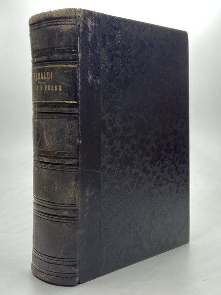 Due volumi legati in uno, legatura coeva in mezza pelle con titoli dorati e piatti in carta nera con motivo floreale, 8vo cm16.5x24, pp 480, 591 (1); ritratto dell’autore all’antiporta del primo volume, occhietti. Corposa raccolta di componimenti del poeta e “improvvisatore” novarese, autore di svariati poemi e prose dedicati a località ed eventi locali e internazionali, politica risorgimentale, biografie, viaggi, invenzioni. fra questi segnaliamo: «Il Monte Bianco», la bonapartiana «Il Salice di S. Elena» che gli valse l’acclamazione dei parigini, «Il telegrafo elettrico» con versione latina di G. Gando, «Nel solenne aprimento della via ferrata di Susa», «Lo Statuto Subalpini», «L’Armeria Reale di Torino», e il lungo poema «La Dora» diviso in capitoli che seguono il corso del fiume. Primo tomo datato 1862, secondo tomo 1861.
