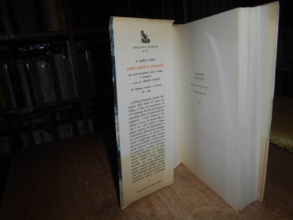 FEDERICO GARCIA LORCA. Bologna, S.T.E.B. per Guanda, 1960. Canti gitani e andalusi. III ristampa della VI edizione. Studi introduttivi, note bibliografiche, testo, versione e commento a cura di Oreste Macrì. In-8°, br. con sovracopertina. 487 pp. con testo a fronte in spagnolo. Sovracopertina con usura al vertice. Libro ottimamente conservato. Neg. mob. 2 carc.