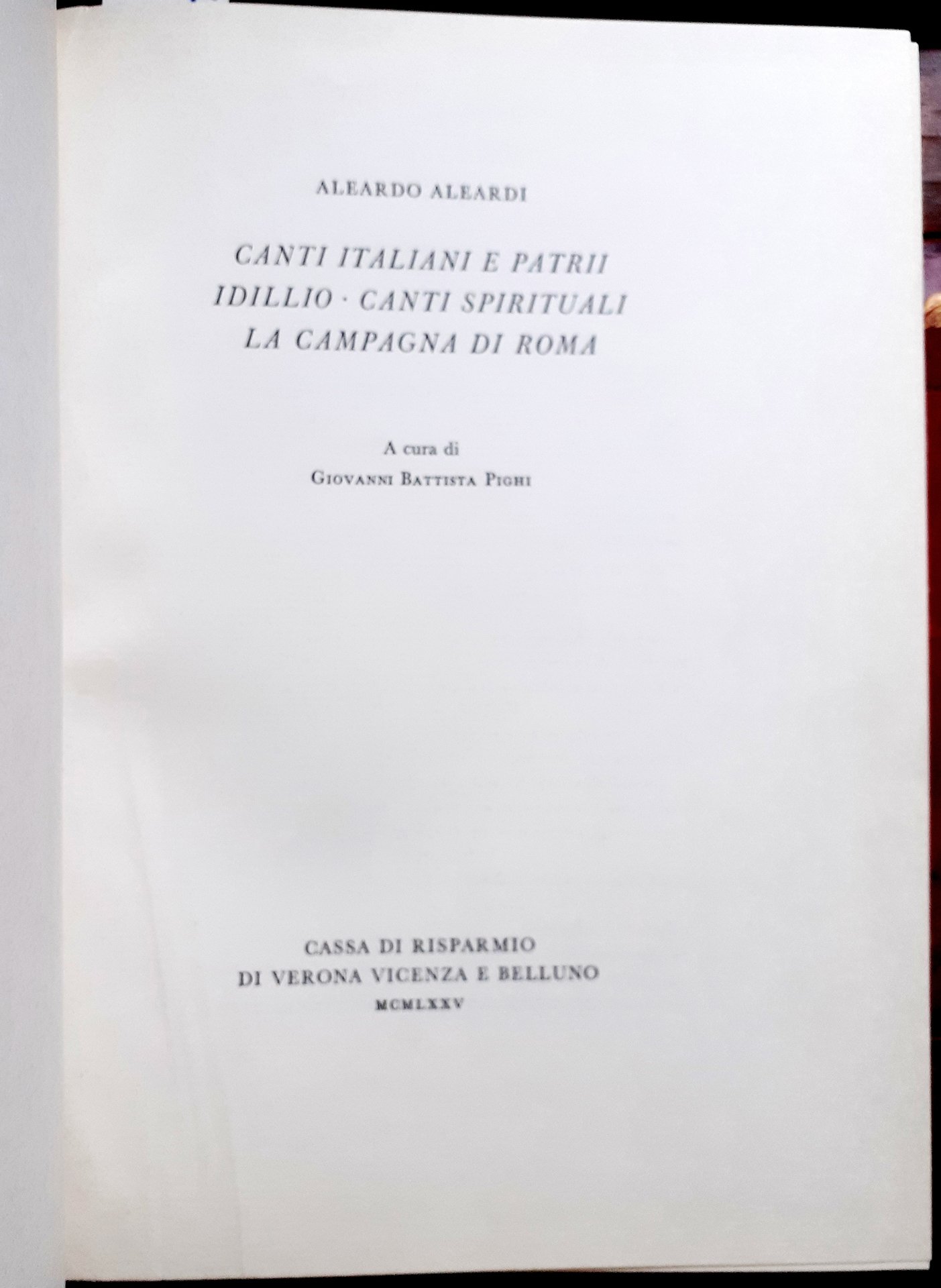 CANTI ITALIANI E PATRII. IDILLIO. CANTI SPIRITUALI. LA CAMPAGNA DI ROMA. A cura di Giovanni Battista Pighi.