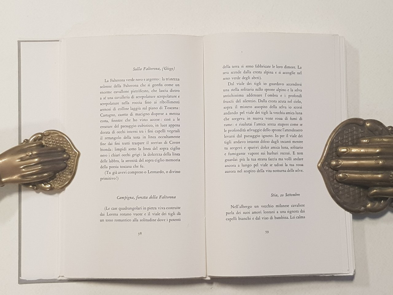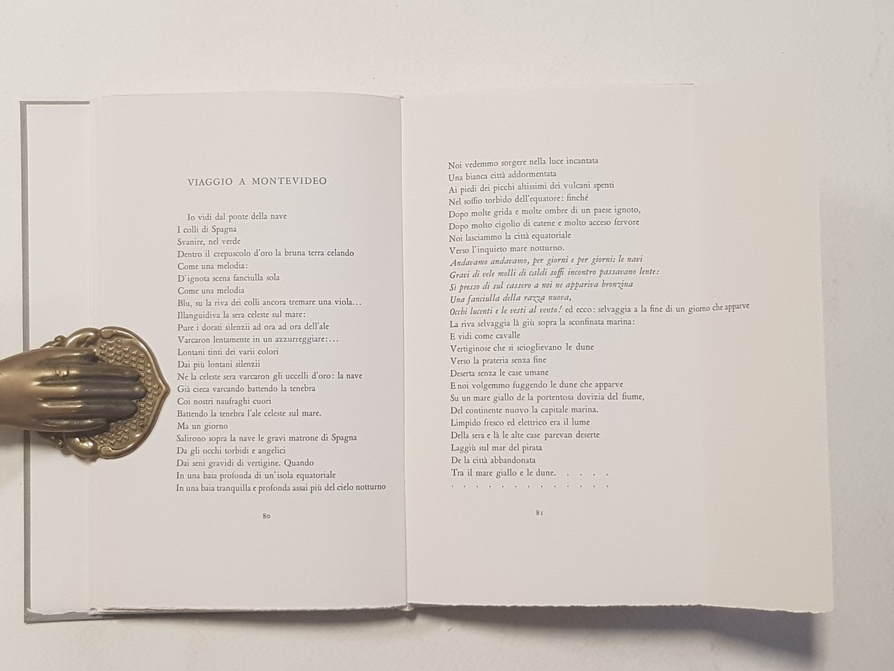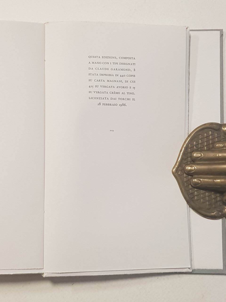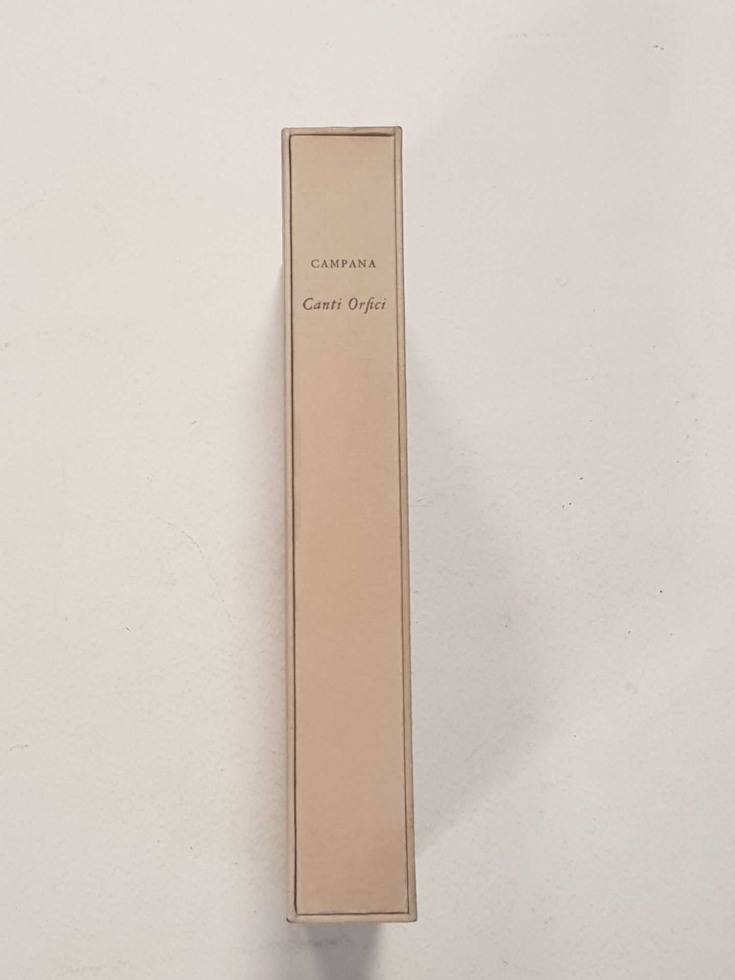 In 16°; pp. 170 (6); brossura editoriale a risvolti velinata; titolo al piatto e al dorso; camicia (con titolo al dorso) e cofanetto in cartone grigio muto.<BR>CONDIZIONI MOLTO BUONE con ingiallitura al dorso della camicia.<BR>Edizione in 440 copie numerate; nostra copia n. 229.