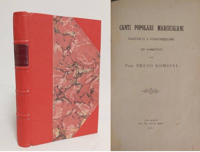 in-8, pp. XV, 290, (2), bella rileg. mod. m. pelle rossa con angoli, tass. e tit. oro al d. con nervi, piatti in cart. dec., risguardi in carta marmorizz. Ediz. orig. Tra canzoni, canti religiosi, cantilene, niennenanne, compaiono anche diversi canti in dialetto, con puntuali note a piè di pagina. Ottimo esempl. [190]
