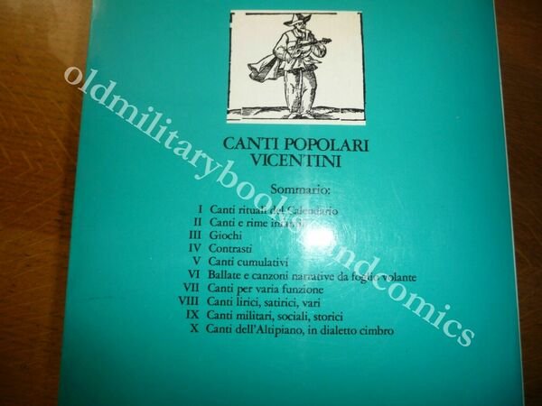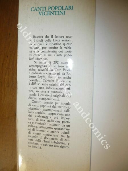 TITOLO: CANTI POPOLARI VICENTINI RACCOLTI CON LE MUSICHE DI VERE PAIOLA ORDINATI E ANNOTATI DA ROBERTO LEYDI DESCRIZIONE: Neri Pozza Ed. Vicenza 1981, br. ed. ill. col. con alette 86 ill. b/n n.t., pp. 452 in 8°. CONDIZIONI: Perfette VOLUME INTONSO. PESO / WEIGHT: 900 gr. without package