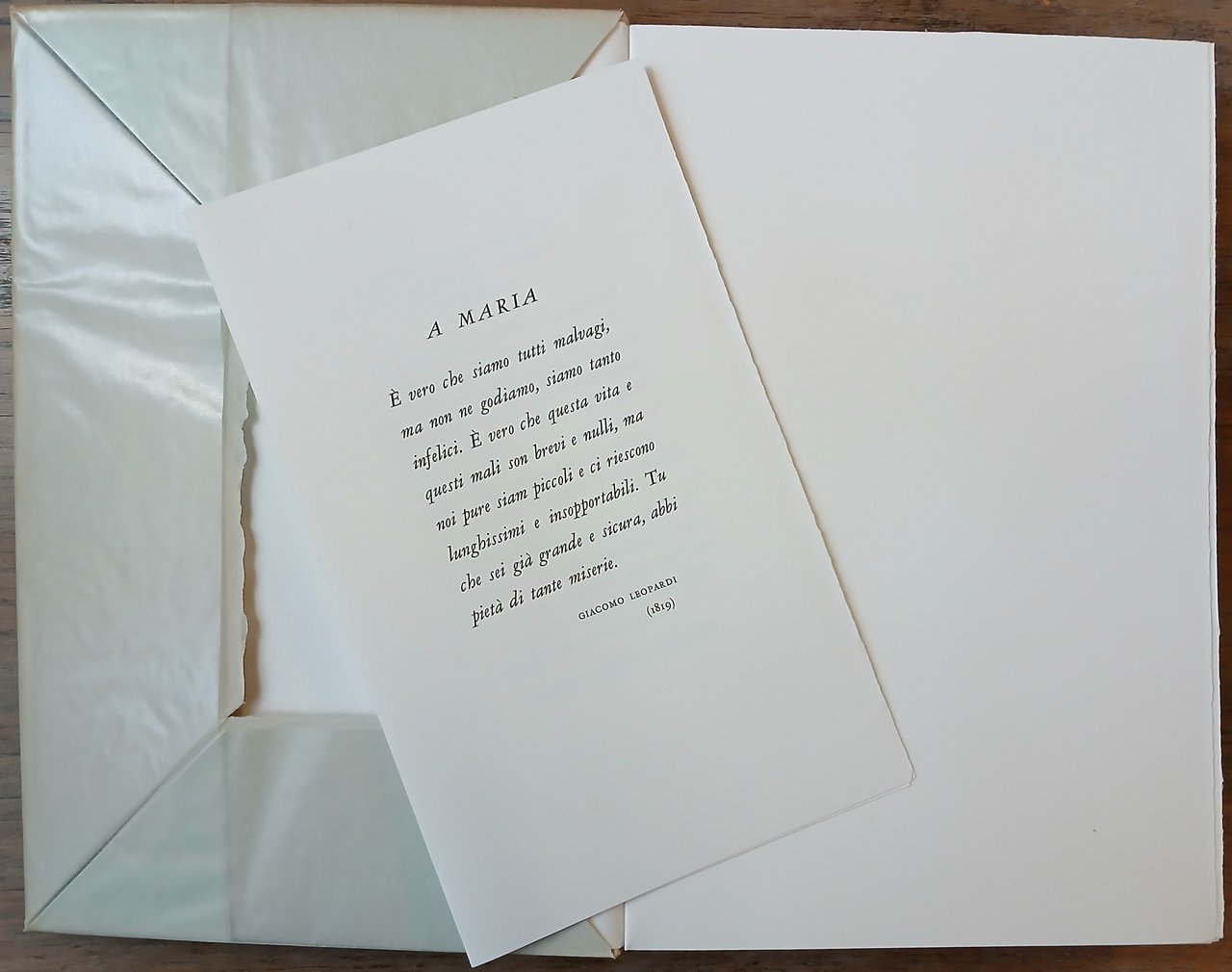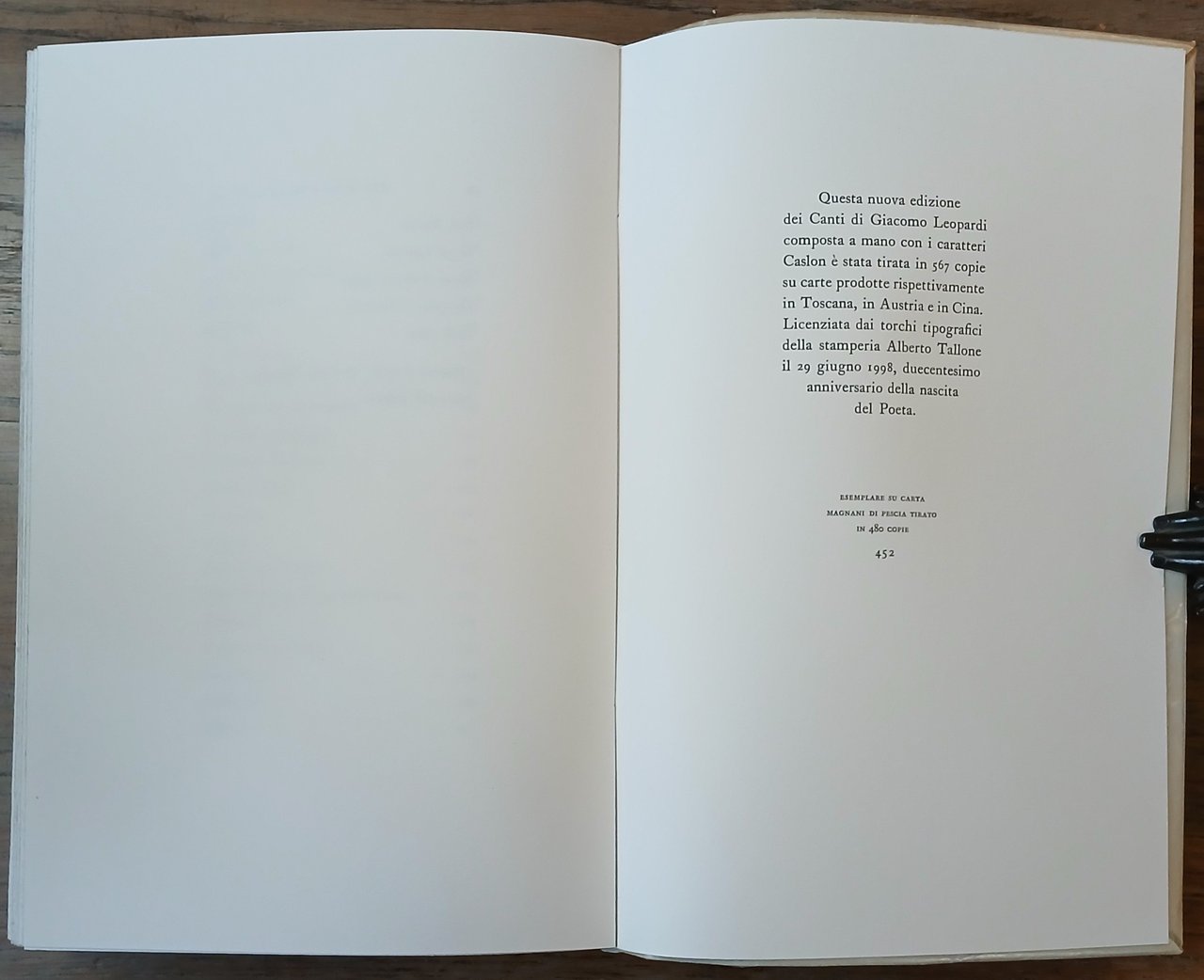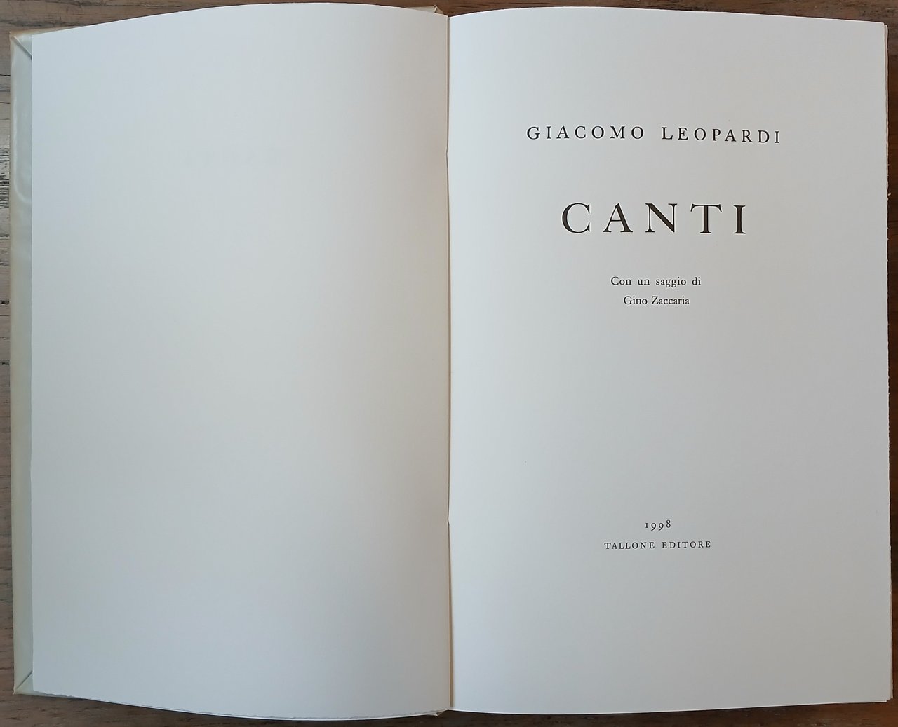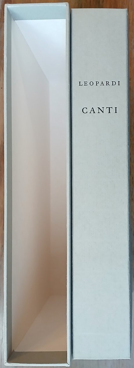 In 8° grande, brossura editoriale con risvolti protetta da velina, camicia e custodia in cartone rigido rivestiti da carta Ingres grigia, pp. 241,(11). Inserto volante di pp. 4 con una poesia di Giacomo Leopardi ("A Maria", 1819) ed il testo dell'annuncio della nascita del poeta compilato dal padre Monaldo Leopardi Confalonieri. Edizione e testo critico di Gino Zaccaria. Dal colophon : "Questa nuova edizione dei Canti di Giacomo Leopardi composta a mano con i caratteri Caslon è stata tirata in 567 copie su carte prodotte rispettivamente in Toscana, in Austria e in Cina. Licenziata dai torchi tipografici della stamperia Alberto Tallone il 29 giugno 1998, duecentesimo anniversario della nascita del Poeta". Esemplare in ottimo stato, n. 452 della tiratura di 480 copie stampata su carta avorio delle Cartiere Magnani di Pescia.