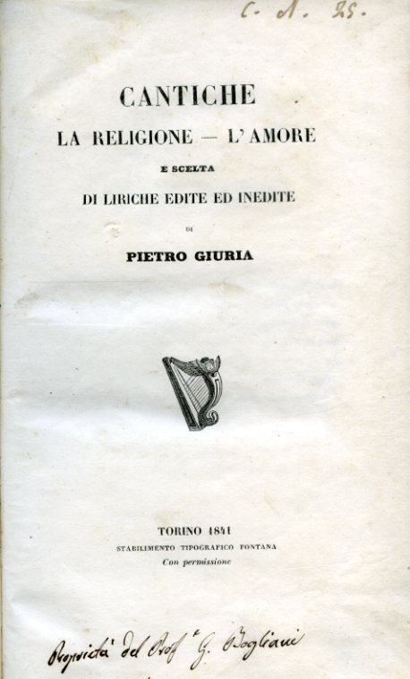 2 voll. in un tomo in-8°, pp. 120, (2); 64 + 6 nn. di 'Estratto dal Subalpino. Giornale di Scienze, Lettere ed Arti'; legatura del tempo m. pelle marrone con titolo e fregi oro al dorso. Vignette incise ad entrambi i frontespizi. Nota di possesso del tempo al primo frontespizio, dedica autografa dell'autore all'amico Giuseppe Bogliani al secondo frontespizio. Ottimo stato. Edizione originale di entrambe le raccolte poetiche. La seconda raccolta contiene liriche ispirate, fra l'altro, a personaggi e vicende genovesi: Cristoforo Colombo, Santa Caterina de'Fieschi, il giovane patriota Pietro Canevari morto appena ventenne, etc. Il Giuria, nato a Savona nel 1816, morto nel 1876 a Genova, fu professore di lettere all'Università di Genova, poeta e fecondo poligrafo, amico di Silvio Pellico. Cfr. Codignola, Pedagogisti, p. 246.
