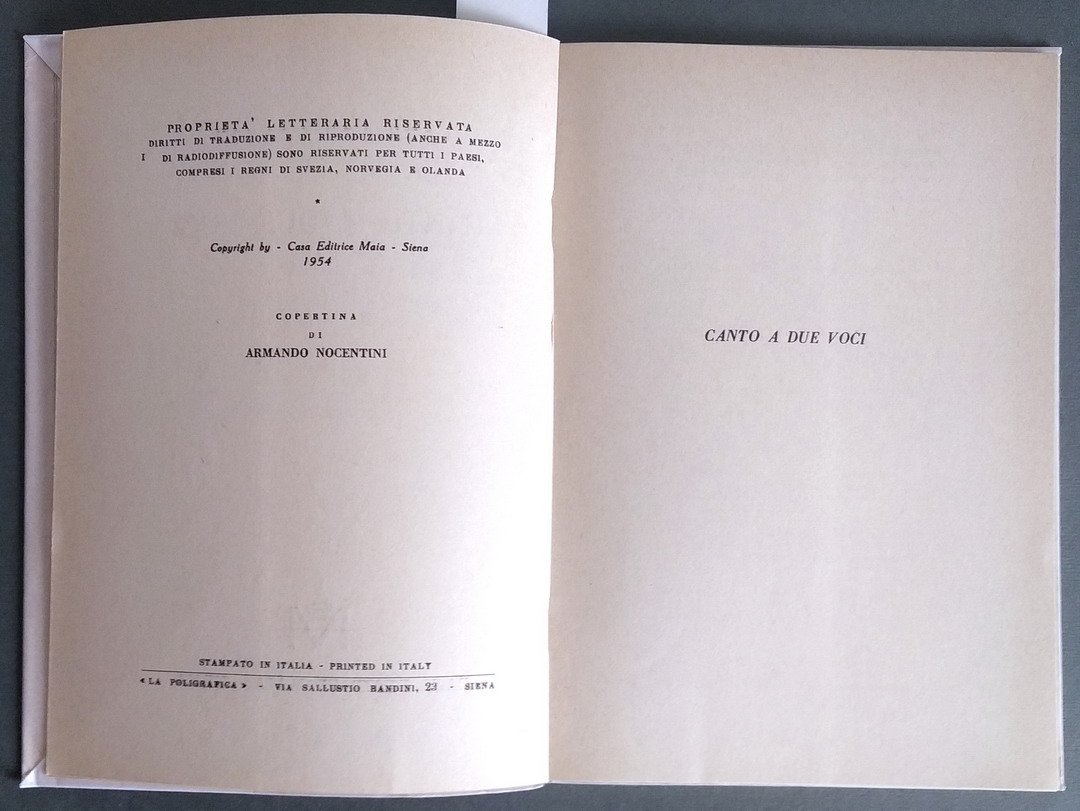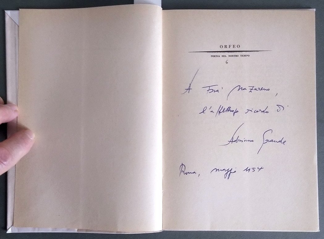 Vol. in -8 (13,5 x 19,5 cm.), brossura editoriale col. avorio con titoli in nero e verde sul piatto ant., velina trasparente di protezioen, pp. 56, (2). Dedica con firma autografa dell'autore sul primo foglio bianco, nel complesso in buone condizioni.
