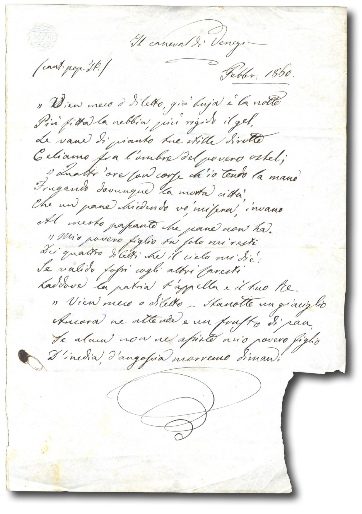 >1 pagina in-8 su carta azzurra con in alto a destra inciso a secco ''Bath''. Foglio volante ben vergato che riporta passo di anonimo canto popolare ispirato al celebre carnevale veneziano. ''Vien meco o diletto, già buja è la notte, più fitta la nebbia...''.