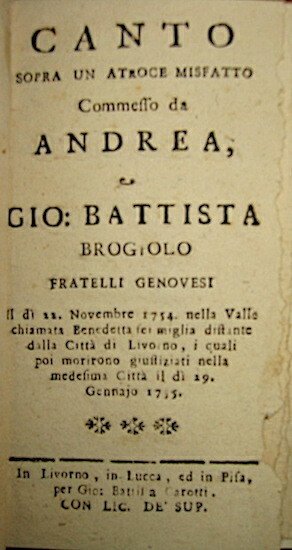 Canto sopra un atroce misfatto commesso da Andrea, e Gio. Battista Brogiolo fratelli genovesi il dì 22 Novembre 1754 nella Valle chiamata Benedetta sei miglia distante dalla Città di Livorno, i quali poi moriromo giustiziati nella medesima Città il dì 29 Gennaio 1755