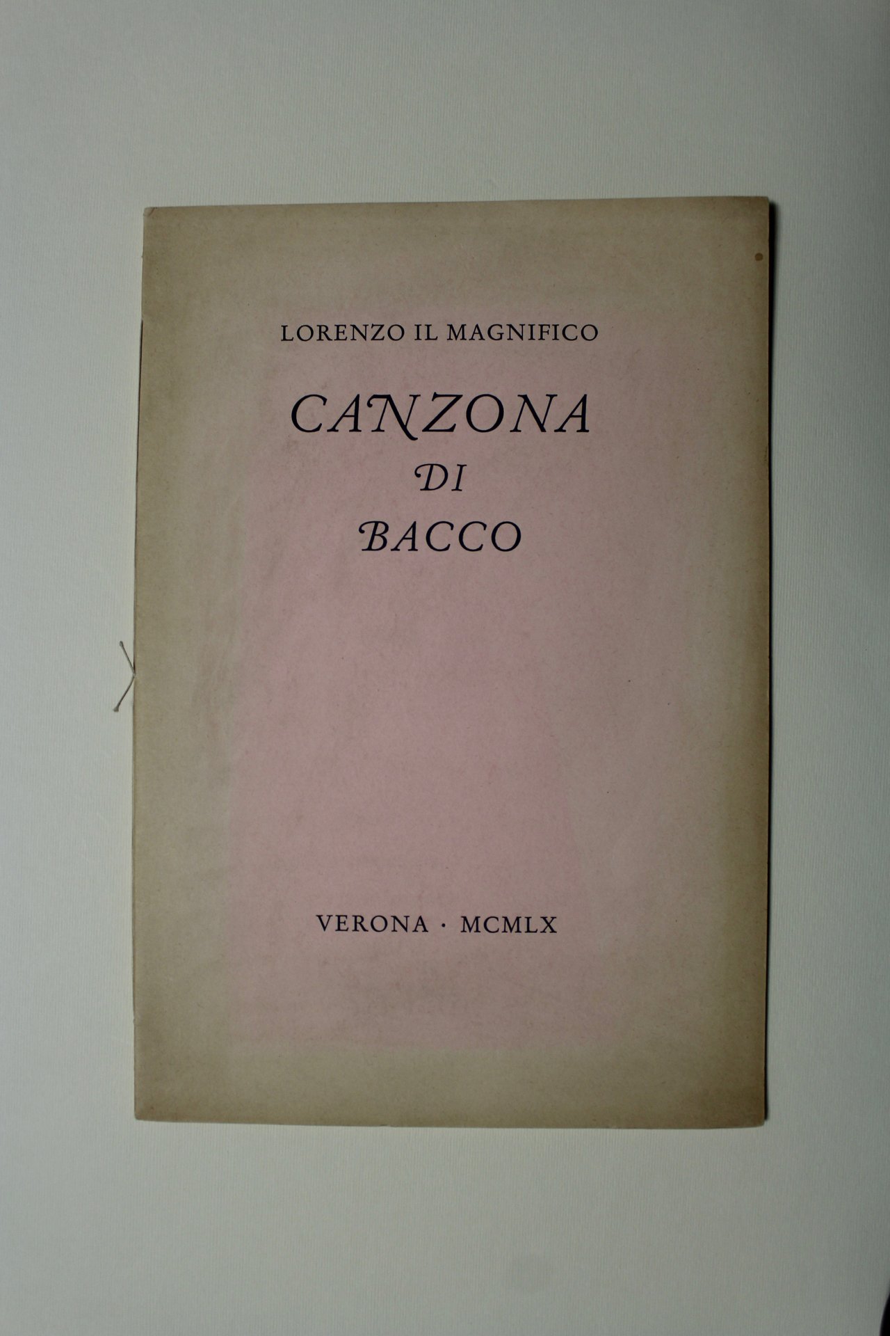 In 4° (290x200), pagg. 8 non num. con una vignetta alla carta terza. Cartoncino edit. con titolo a stampa. Eseguito su carta a mano Ventura, composto con carattere Garamond corsivo. Dal colophon: "Questa stampa della canzone del Magnifico in 100 esemplari, è stata eseguita da Franco Riva, con il suo torchio privato a Verona, nel maggio Mcmlx". Dedica autografa di Franco Riva. Molto ben conservato eccetto un ingiallimento superficiale ai piatti nella parte esterna. Editiones Dominicae, 16.