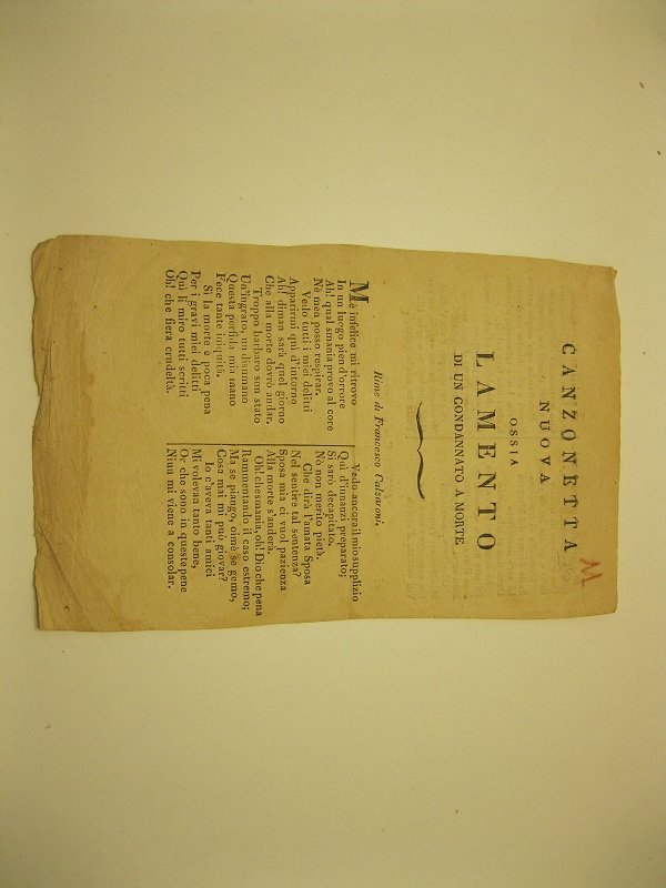 Foglietto volante (cm 14 x 23), stampato al recto e al verso, contenente il lamento in rima del condannato a morte che si pente dei suoi delitti: 'Domattin di buon'ora / Sulla Piazza del Mercato / Li' saro' decapitato / Daro' fine al mio penar.'.