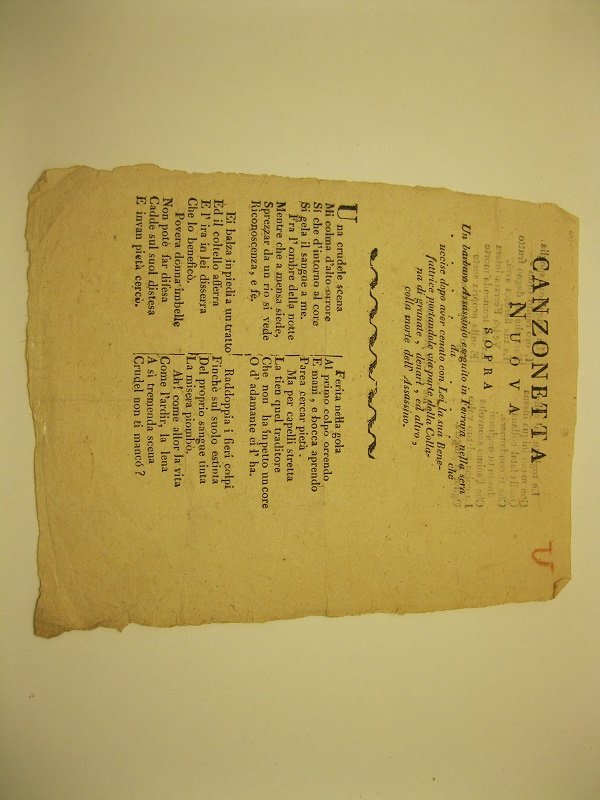 Canzonetta nuova sopra un barbaro assassinio eseguito in Ferrara nella sera da che uccise dopo aver cenato con lei la sua Benefattrice portandole via parte della collana di granate, denari, ed altro, colla morte dell'assassino