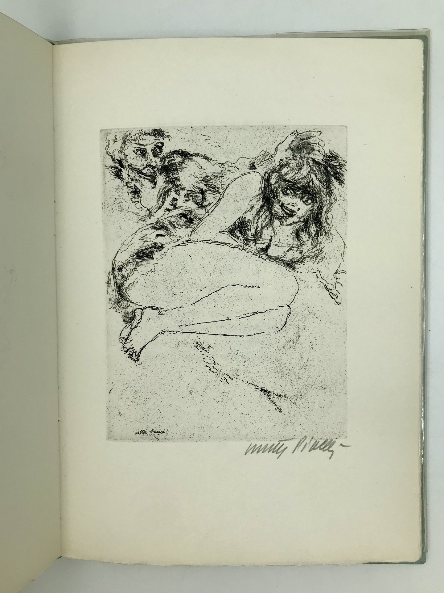 In 4to (247x177 mm). 29, [3] pp. Illustrato da Walter Piacesi con 3 acqueforti a piena pagina. Legatura editoriale in mezza pergamena con titolo in oro al dorso, taglio superiore azzurro, gli altri in barbe, piatti rivestiti in carta azzurra; non presente la custodia.