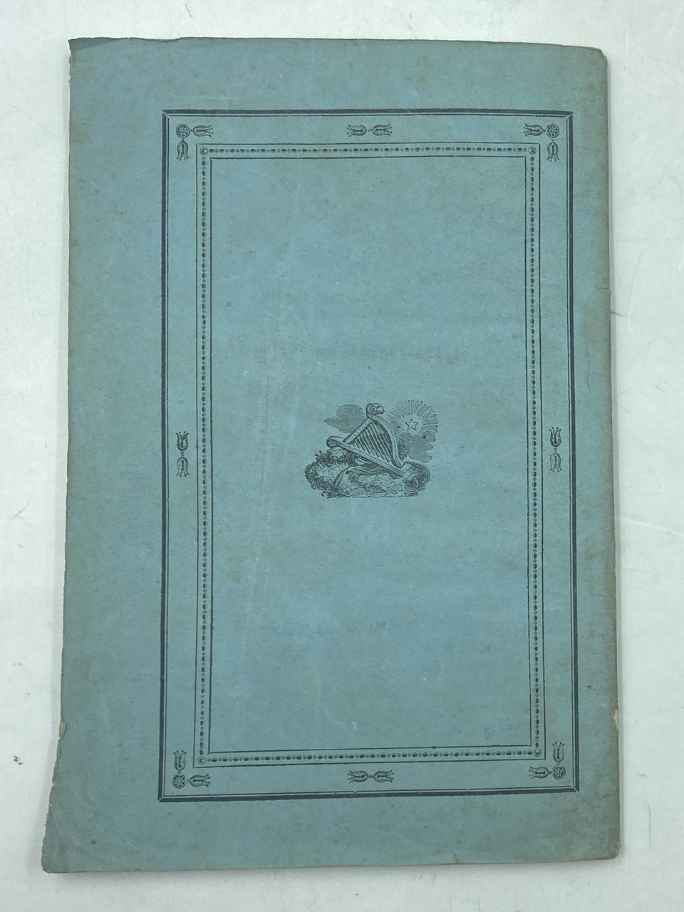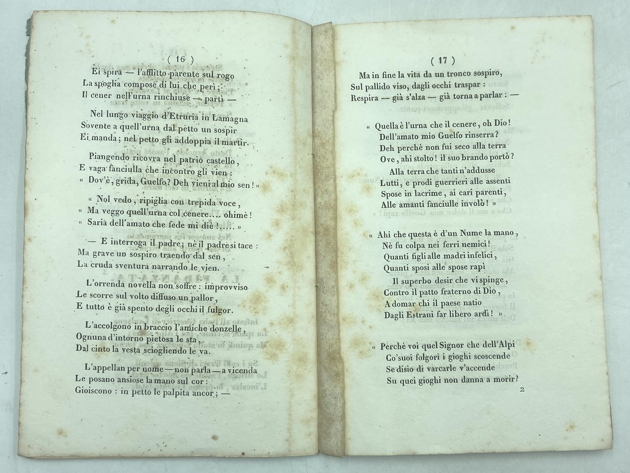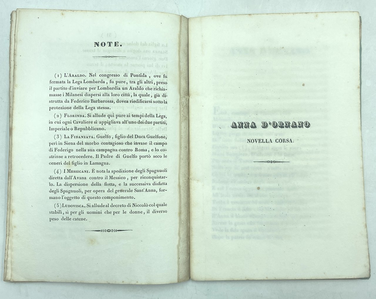 Brossura editoriale a stampa con titoli entro cornice tipografica, in ottavo cm 19.5 x 13, pp 46 (2), fregio sul frontespizio. Qualche fioritura sulle carte di guardia e le pagine 15-17, leggeri difetti sui margini dei piatti (piccoli strappi e mancanze). Raro opuscolo che raccoglie alcuni componimenti di Domenico Serafino Pucci, letterato sarzanese fratello del più celebre Camillo, pittore. Cinque sono le canzoni e romanze, accompagnate da una chiosa dell'autore: L'Araldo e Florinda , La Fidanzata, I Messicani, Ludovisca. L'ambientazione è storica, perlopiù medioevale: per le prime il richiamo esplicito è alla Lega Lombarda, cui negli ultimi anni della vita l'autore dedicò un poema, e per I Messicani il riferimento è a Cortés. La seconda parte del volume è occupata dalla «novella corsa» sulla tragica vicenda di Vannina d'Ornano e Sampiero Corso di Bastelica; anche questo racconto in versi sciolti, che l'autore aveva già pubblicato a Fivizzano nel 1832, è accompagnato da nota storica esplicativa («Tolga il Cielo che in questo componimento io voglia diffamare, come oppressore della Corsica, l'antico Senato Ligure.»). Non comune, tre copie in ICCU tra Livorno e Pistoia (aprile 2025). Passano, I novellieri italiani in verso, p. 247: «In questo libretto, pubblicato senza il nome dell'autore, . un bello verseggiare, una locuzione schietta ed elegante, fanno godere di una lettura dilettosa e profittevole»; Passano, Dizionario, p. 53; Flori, Bibliographie générale de la Corse II, 10029.