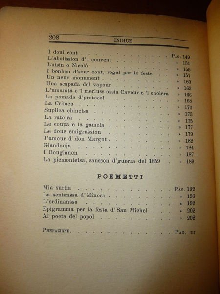 DESCRIZIONE: Fogola G.B. Editore Torino 1926 nuova edizione con prefazione, br. ed. ill. pp. 205 in 16°. Ennesima edizione della celebre raccolta di canti piemontesi del Brofferio (Castelnuovo Calcea, 1802 - Locarno, 1866). "Poeta che seppe dare al nativo dialetto la grazia dell'anacreontica e la fierezza e la vivacità della satira democratica", come scrisse il Carducci, il Brofferio iniziò a comporre le proprie poesie vernacolari subito dopo gli eventi politici del 1831, continuamente aggiornandole sino al 1859 con una netta prevalenza dei motivi patriotico - risorgimentali. L'atteggiamento politico di fondo è progressista e avverso al moderatismo cavouriano, reso oggetto di molti strali satirici. Indice completo in foto. CONDIZIONI: Buone, tracce di sporco, vol. con timbro di biblioteca estinta. Perfetto all'interno e quasi totalmente INTONSO. PESO / WEIGHT: 213 gr. without package