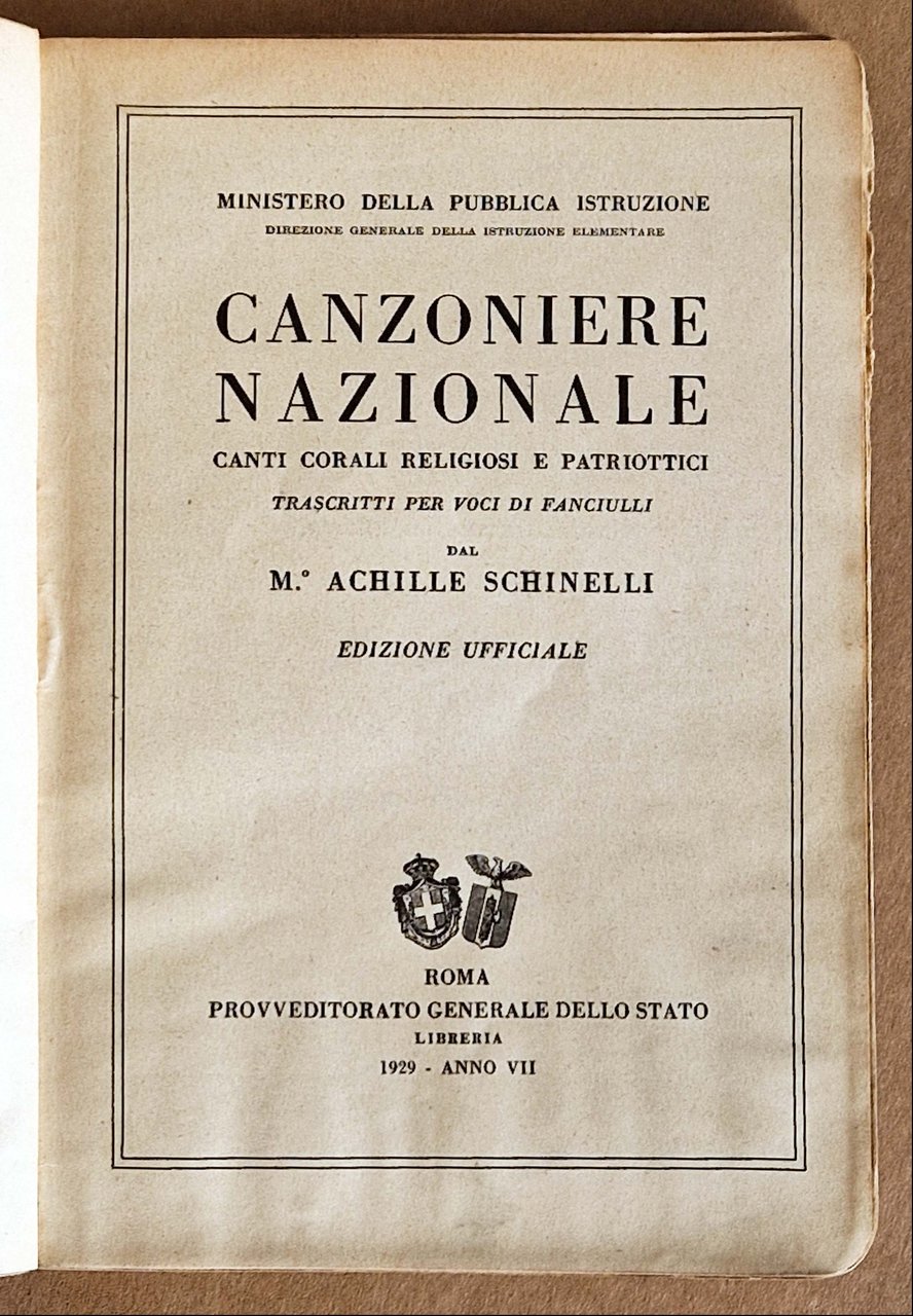 Canzoniere nazionale. Canti corali religiosi e patriottici trascritti per voci di fanciulli dal Maestro Achille Schinelli. Edizione ufficiale.