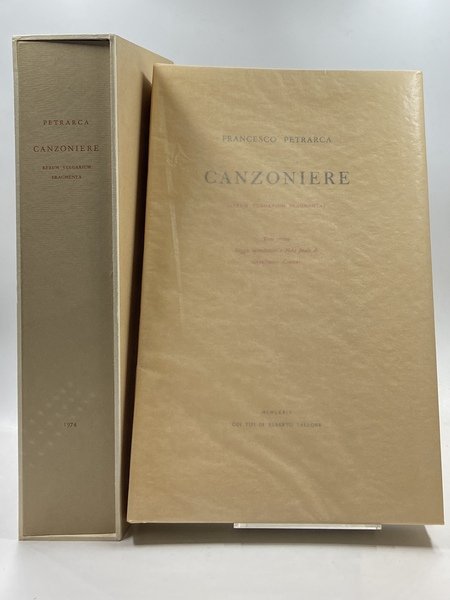 Brossura protetta da velina, con custodia e camicia editoriale, pp XLIV 310 (2). Uno dei 470 esemplari su carta della Cartiera Miliani di Fabriano filigranata col nome “Petrarca” (#345). La lezione del Canzoniere qui proposta fu approntata con grande rigore filologico da Gianfranco Contini per l’edizione parigina di Tallone del 1949, e venne fatta propria anche da Einaudi (1964).