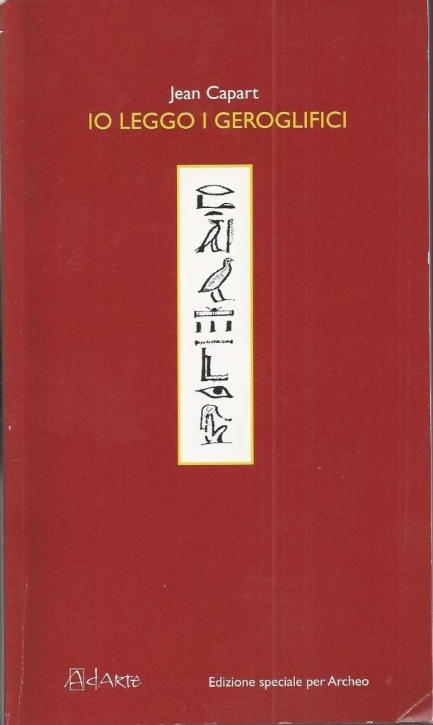 Jean Capart, Io leggo i geroglifici, traduzione di Olimpia Soleri, edizione italiana a cura di Alessandro Roccati, Adarte, Torino 2008, pp. 111, ill. b.n., cm 20, br. ed. Titolo originale: Je li sles hiéroglyphes. In calce alla prima di copertina: Edizione speciale per Archeo. Minime sgualciture alla brossura, per il resto perfetto.