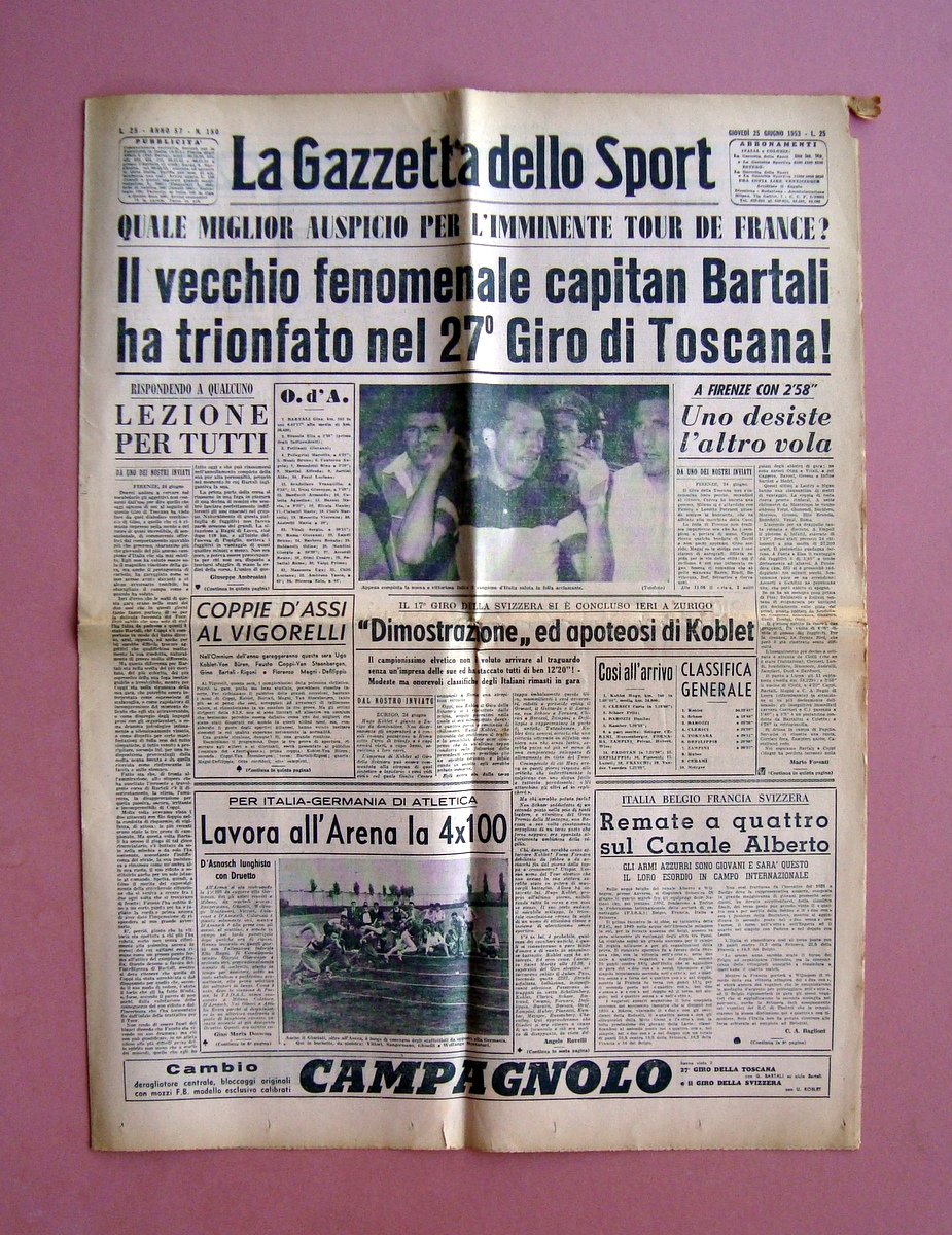 Capitan Bartali 27°Giro Toscana ciclismo La Gazzetta dello Sport 25/6/1953 n 150