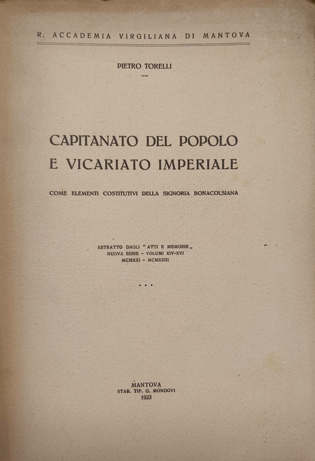 in-8 gr., pp. 151, bross. edit. Estratto dagli Atti e Memorie", R. Accademia Virgiliana di Mantova. Importante studio sulle origini della signoria mantovana, suffragato da note e trascrizioni di molti documenti d'archivio Invio autogr. dell'A. Raro. [384]