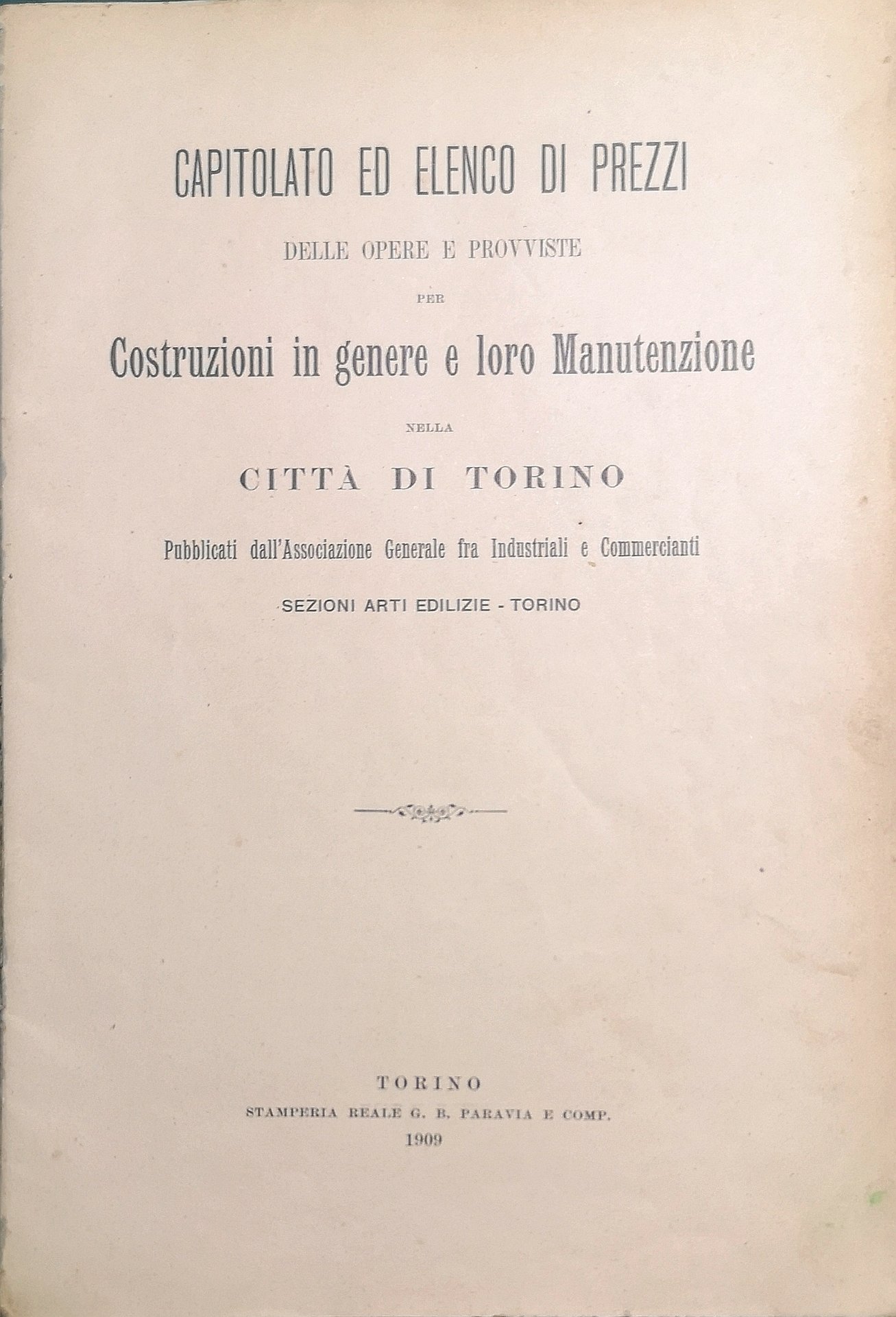 Capitolato ed elenco di prezzi delle opere e provviste per costruzioni in genere e loro manutenzione nella Città di Torino. Pubblicati dall'Associazione generale fra industriali e commercianti. Sezione arti edilizie - Torino.