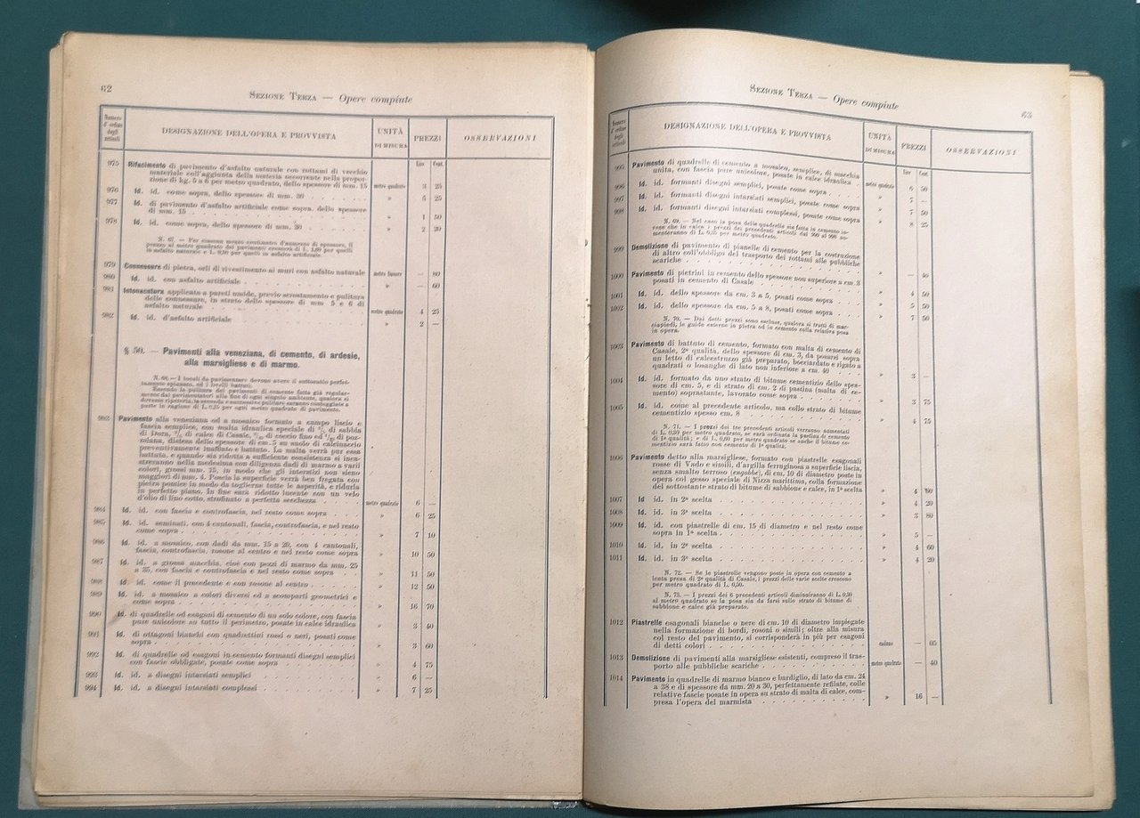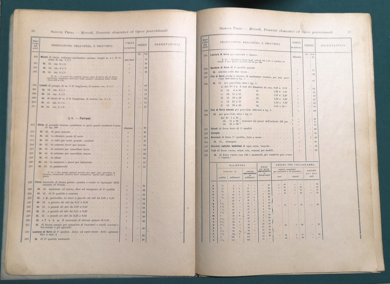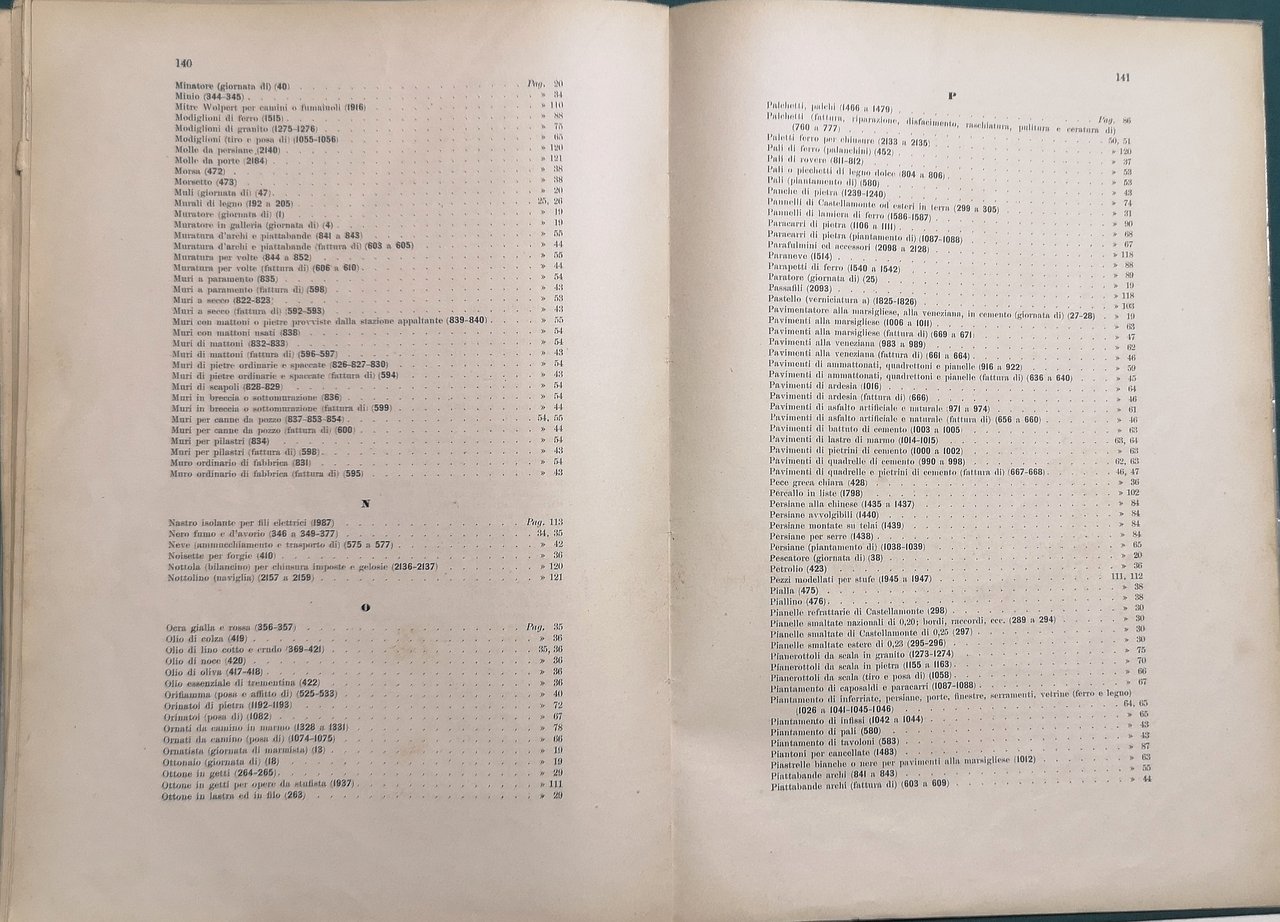 >in-4 grande, pp. IV, 148 con numerose tabelle e prezziari. Broch. edit. (dorso restaurato). Edizione originale di quest'opera di minuziosa e precisa documentazione, non solo dei prezzi di materiali e manodopera, ma anche delle condizioni contrattuali di ciascun lavoro, poiché "non si può concepire un elenco di prezzi d'opere senza che sia detto come queste opere si intendano eseguite". Rarissimo. Buon esemplare.