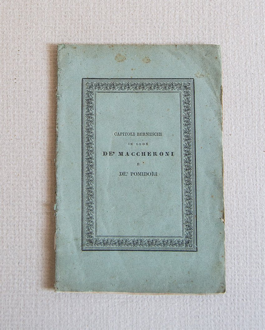 (11 x 16) Brossura originale. 28 pp. Due poesie in lode di quelli che oggi consideriamo i cibi napoletani per eccellenza: i maccheroni e i pomodori. L'autore li mette a confronto con molti altri ingredienti, per poi scoprire che sono tutti scarsi sostituti di questi cibi sublimi.