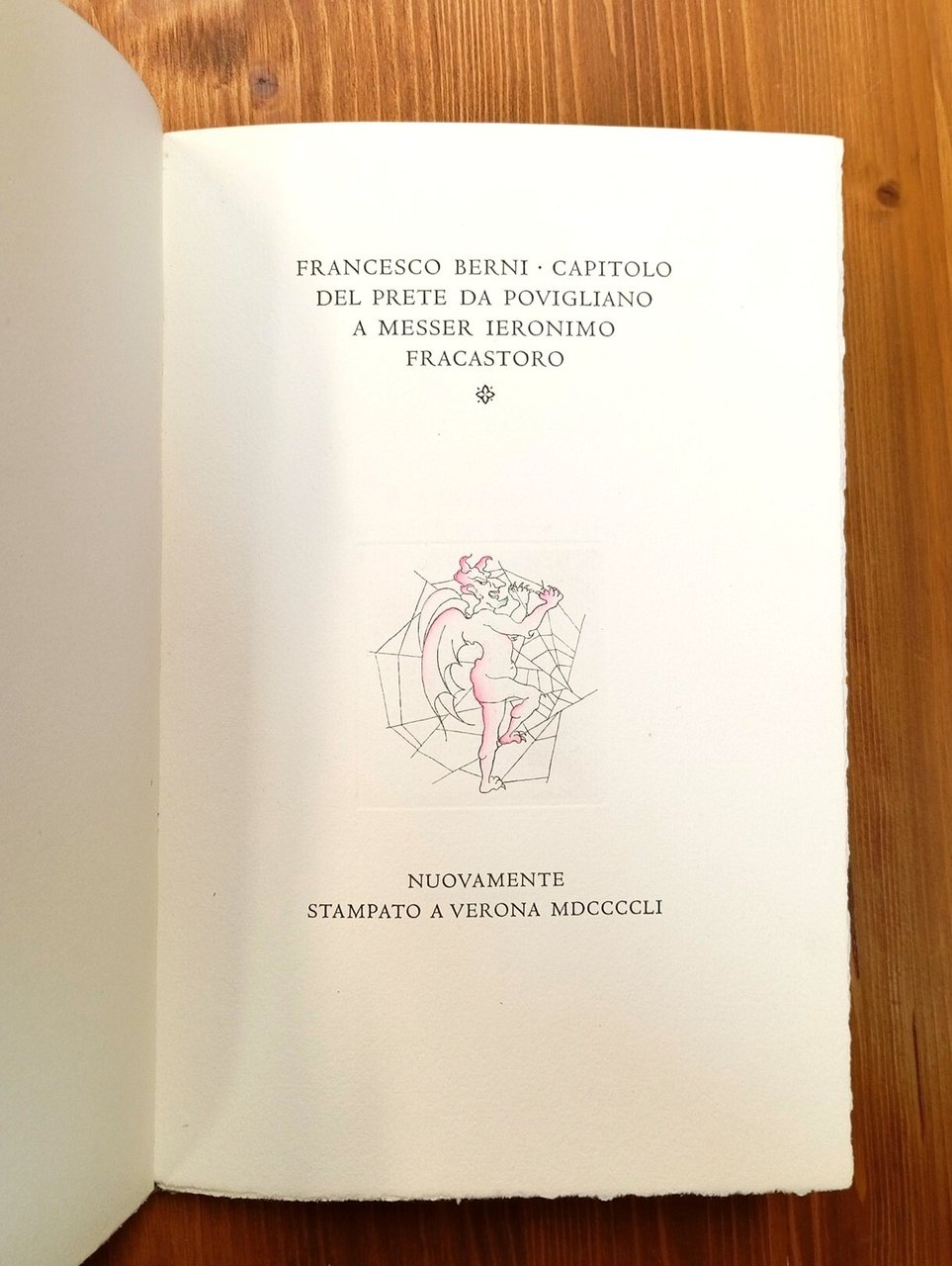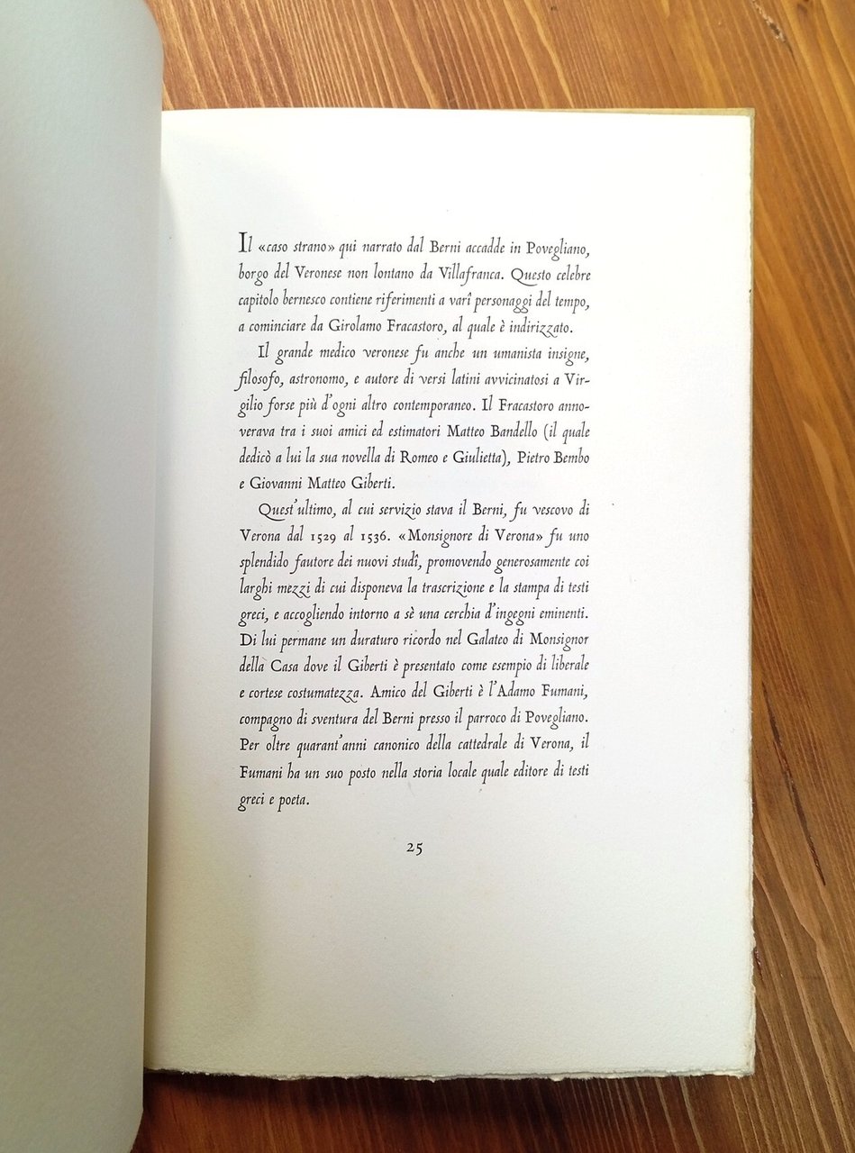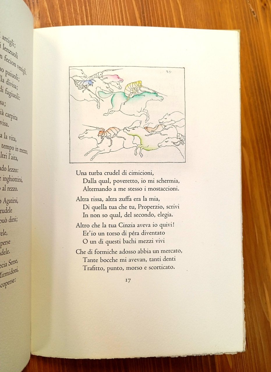 Edizione d'arte in tiratura di soli 125 esemplari numerati a stampa, il nostro è il n. 56 - Legatura editoriale in mezza pergamena con titolo in oro al dorso, piatti cartonati con fregio in oro al fronte, taglio superiore dipinto in oro, 25 pagine con 7 pregevoli acqueforti originali dell'artista Renzo Sommaruga, colorate a mano, ed una nota al lettore di Giovanni Mardersteig. Versi scritti nel 1532 e dedicati al medico veronese Fracastoro. Stampa su carta a mano Magnani di Pescia, carattere Centauro tondo e Arrighi Vicenza corpo 16. La custodia protettiva risulta brunita, fessurata alle cerniere e mancante del lato superiore; il volume riporta solo lievi segni del tempo esterni, nel complesso ottimamente conservato. Bell'esemplare di un'edizione da collezione, rara e ricercata.