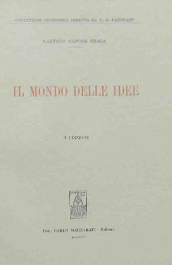 Gaetano Capone Braga, Il mondo delle idee, Dott. Carlo Marzorati Editore, Milano 1954, seconda ed., pp. VIII, 445, cm 26, br. ed. Collana Filosofica diretta da U. A. Padovani. Indice: Prefazione – Introduzione – Cap. I: Platone – Cap. II: Aristotele – Cap. III: Plotino – Cap. IV: S. Agostino – Cap. V: S. Tommaso – Cap. VI: La filosofia moderna – Cap. VII: Il mondo delle idee e il mio realismo – Appendice I: La dottrina degl’intermediari matematici si può rintracciare nei dialoghi di Platone? – Appendice II: L’etica di Aristotele e la dottrina delle idee-numeri di Platone – Appendice III: S. Agostino ha letto Platone – Indice dei nomi. In chiusura, abstract in francese, inglese e tedesco. Firma d’appartenenza alla prima pagina, timbro Omaggio alla quarta di copertina. Carta lievemente brunita, per il resto perfetto.