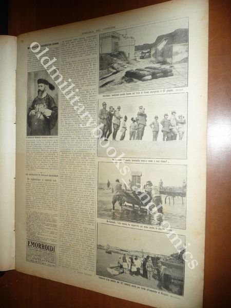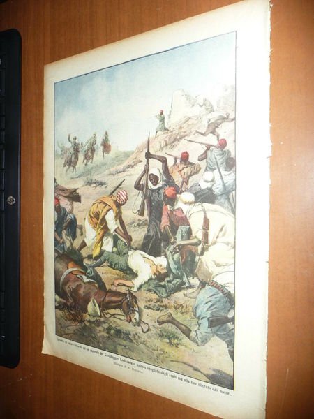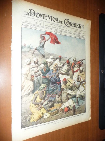 DESCRIZIONE: Domenica del Corriere, Milano, Anno XIV n. 28 (14-21 Luglio 1912). COPERTINA: "Le curiosità della guerra: donne arabe che incitano con drappi e con la voce i combattenti e provvedono a caricar loro i fucili" (ill. di A. Beltrame). RETRO: "Episodio di valore attorno ad un caporale dei Cavalleggeri Lodi caduto, ferito e spogliato dagli arabi ma alla fine liberato dai nostri" (ill. di A. Beltrame). INTERNO: Foto di soldati a Sidi-Said e Bu-Kamech. Funerale di un soldato del 79° fanteria a Bengasi. La Domenica del Corriere è stato un popolare settimanale italiano fondato a Milano nel 1899 e chiuso nel 1989. Apparve per la prima volta nelle edicole l'8 gennaio 1899 come supplemento illustrato del Corriere della Sera. Stampata in grande formato (sul modello del domenicale La Tribuna illustrata), aveva 12 pagine e veniva distribuita gratis agli abbonati del Corriere, oppure si poteva acquistare in edicola per 10 centesimi. La prima e ultima di copertina erano sempre disegnate. Il Corriere si avvaleva di un giovane disegnatore, Achille Beltrame, allora sconosciuto, a cui veniva affidato in ogni numero il compito di rendere con la sua tavola il fatto più interessante della settimana. Dopo la sua morte nel 1945, fu sostituito da Walter Molino che, come il suo predecessore, firmò memorabili copertine. A differenza dei settimanali dell'epoca, la Domenica del Corriere diede ampio spazio alle fotografie e ai disegni, e questo fu uno dei motivi del suo successo. CONDIZIONI: Buone. Non spillato, prov. da rilegatura. PESO / WEIGHT: 100 gr. without package