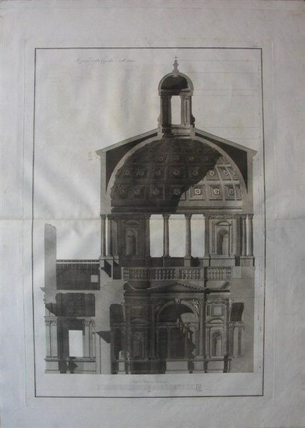 in folio (mm.501x360), pp. (8), 16 + 30 di tavv., bella leg. m. pelle coeva con tit. oro al d., piatti in cart. dec. Con 30 bellissime tavv. inc. in rame (di cui una su doppi pagina) raff. particolari architettonici, spaccati e prospetti della cappella della famiglia patrizia veronese nella chiesa cittadina di San Bernardino. Rara ediz. orig. dell'opera progettata e prodotta da Giuliari dedicata al celebre architetto veronese del XVI sec. Giuliari, Della Tipografia veronese., 1871, pp. 177 segg.: "Lo studio che predilesse il Giuliari, e coltivato avea fin da giovane, era come dissi l'Architettura [.] i disegni delle molte Opere Sanmicheliane Militari che lo strazio Francese mandava poco appresso in un muchio di rovine". L'occasione per la stesura del volume gli fu data quando nel 1793 il Conte Carlo Pellegrini, di cui era il Giuliari parente prossimo, finanziò i restauri della cappella di famiglia che versava da tempo in cattive condizioni: l'incarico di seguire i lavori fu dato al Giuliari stesso che nel contempo si impegnò a contattare i più valenti artisti per assicurarsi l'incisione su rame dei disegni del Sanmicheli eseguiti a mano da Giuseppe Barbieri, giovane artista e architetto veronese. La scelta cadde su Giacomo Mercoli (1745-1825), ticinese, cui offrì un generoso stipendio, vitto e alloggio a Verona per un anno e mezzo. Alla fine del 1816 l'opera venne finalmente alla luce, dedicata all'Imperatore Giovanni d'Austria, con note biografie del Sanmicheli, e genealogiche sulla famiglia Pellegrini. Il volume "costò all'editore intorno a 15,000 Lire Ital., davasi al prezzo di Ital. Lire 60", in sole 312 esemplari di cui soli 112 con le tavole e questi pochi per lo più omaggiati a Letterati, Dignitari, Principi e amici. Sulla prima carta reca un'annotazione manoscritta con il nome "Martinelli Ing. Jacopo". Lozzi 6888. Una lieviss. gora al margine bianco interno di alcune pp., uno strappo riparato alla tav.29, ottimo esempl. a pieni margini. [050]