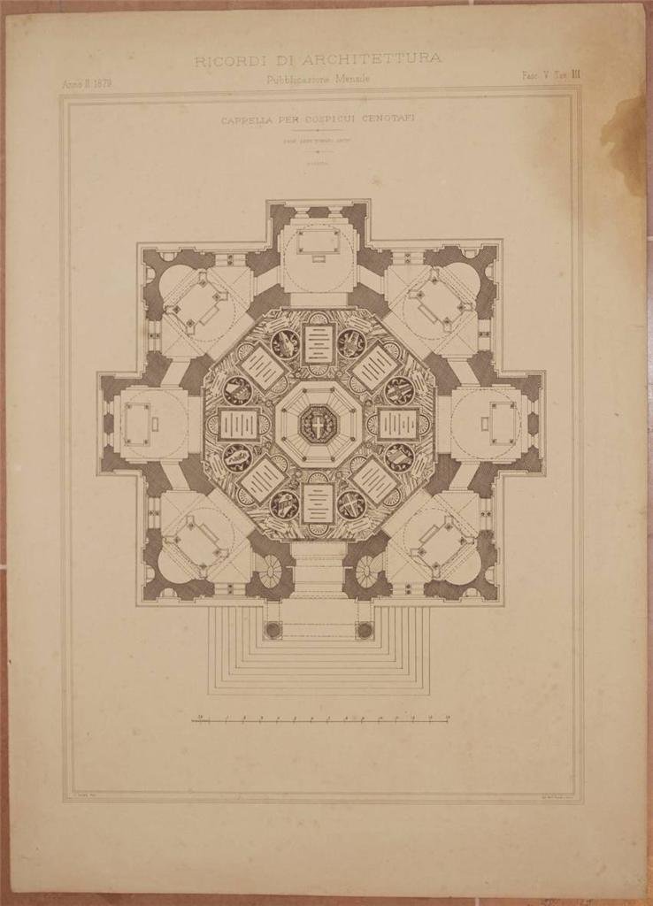 Bella litografia di architettura del 1879 tratta dal periodico mensile "Ricordi di architettura" pubblicato tra il 1878 e il 1900 diretto da Giacomo Roster, C. Corinti e E. Bartoli.<BR>La rivista documentava le numerose progettazioni, talvolta anche di riduzione e di ampliamento che fecero molti architetti dell'epoca. Di grandi dimensioni. TECNICA: Litografia DIMENSIONI FOGLIO: cm 52,5x38 DIMENSIONI INCISIONE: cm 42x31 EPOCA: 1879 CONDIZIONI: Buone condizioni, qualche fioritura. Beautiful lythography of architecture of 1879 taken from the monthly magazine "Ricordi di architettura" published between 1878 and 1900 directed by Giacomo Roster, C. Corinti and E. Bartoli. The magazine documented different projects, sometimes alos of reductioning and expansion done by many architects of that time. Of big size. TECHNIQUE: Lytography PAGE SIZE: cm 52,5x38 PRINT'S SIZE: cm 42x31 PERIOD: 1879 CONDITION: good conditions. Some yellowings and little missing parts in the edges
