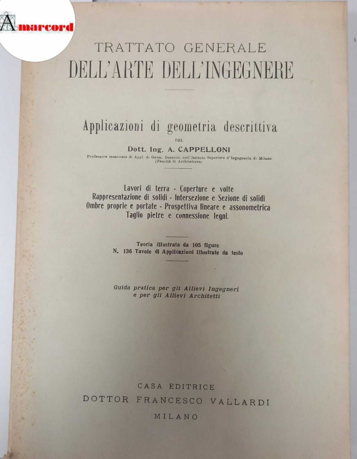 Cappelloni A., Trattato generale dell'arte dell'ingegnere. Applicazioni di geometria descrittiva, Vallardi, 1934, in-8, brossura, pp. 108+136 tavole. Condizioni buone (lieve foxing sulla copertina, qualche lieve strappo sulla copertina).