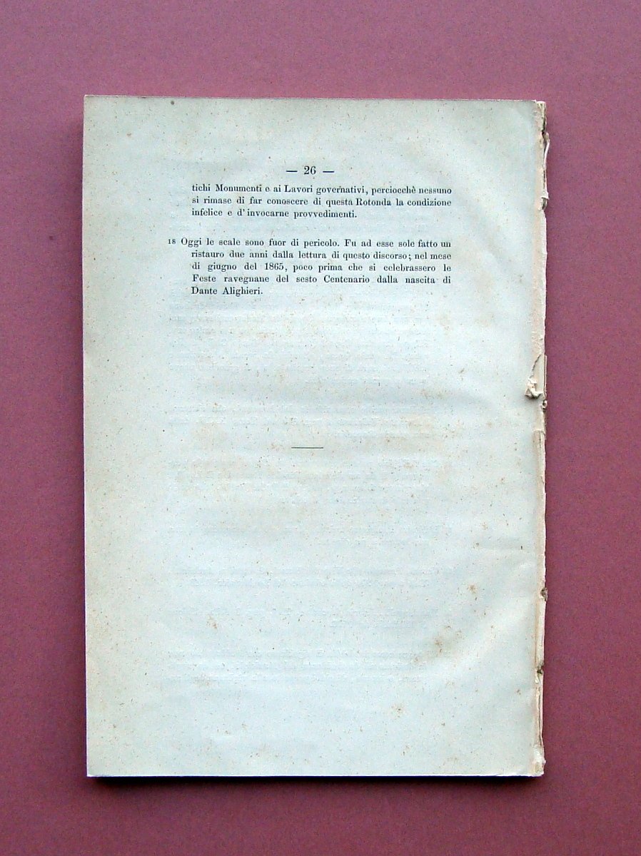 Cappi A., sopra Alcune Considerazioni del Professore Francesco Rocchi intorno alla rotonda di Ravenna discorso del Conte Alessandro Coppi Ravenna con i tipi di G.Angeletti, 1867; cm 21x14,5; pp 26; br. ed., dedica autografa del Conte Cappi (vedi foto). Condizioni di conservazione Esemplare in buone condizioni con tracce del tempo; brossure e dorso mancanti; strappetto alla prima bianca come da foto; interni buoni, esemplare compatto. Dedica autografa del Conte Cappi OPEB.5475 blu
