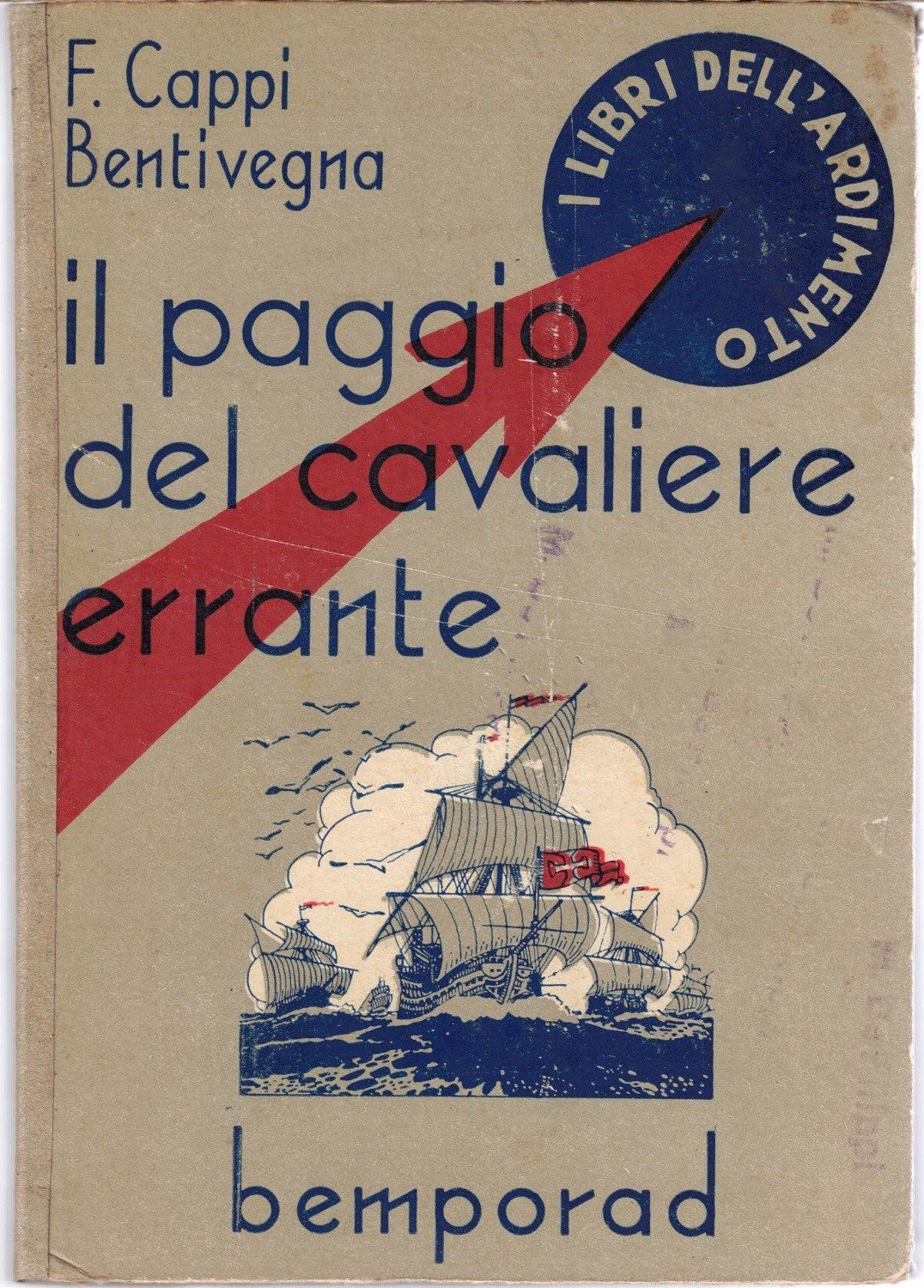 Ferruccia Cappi Bentivegna, Il paggio del cavaliere errante. Un ragazzo al primo giro del mondo nel 1519, R. Bemporad e F.o, Firenze 1937, pp. 173, cm 22, cart. ed. con titoli e ill. col. al piatto. Collana I libri dell’ardimento, 10. Timbri di appartenenza al piatto anteriore, alla carta di guardia enteriore e a due carte interne. Vecchi rinforzi in carta al dorso e alla cerniera interna del piatto anteriore, ordinarie tracce d’uso, carta uniformemente brunita, per il resto esemplare ben conservato.