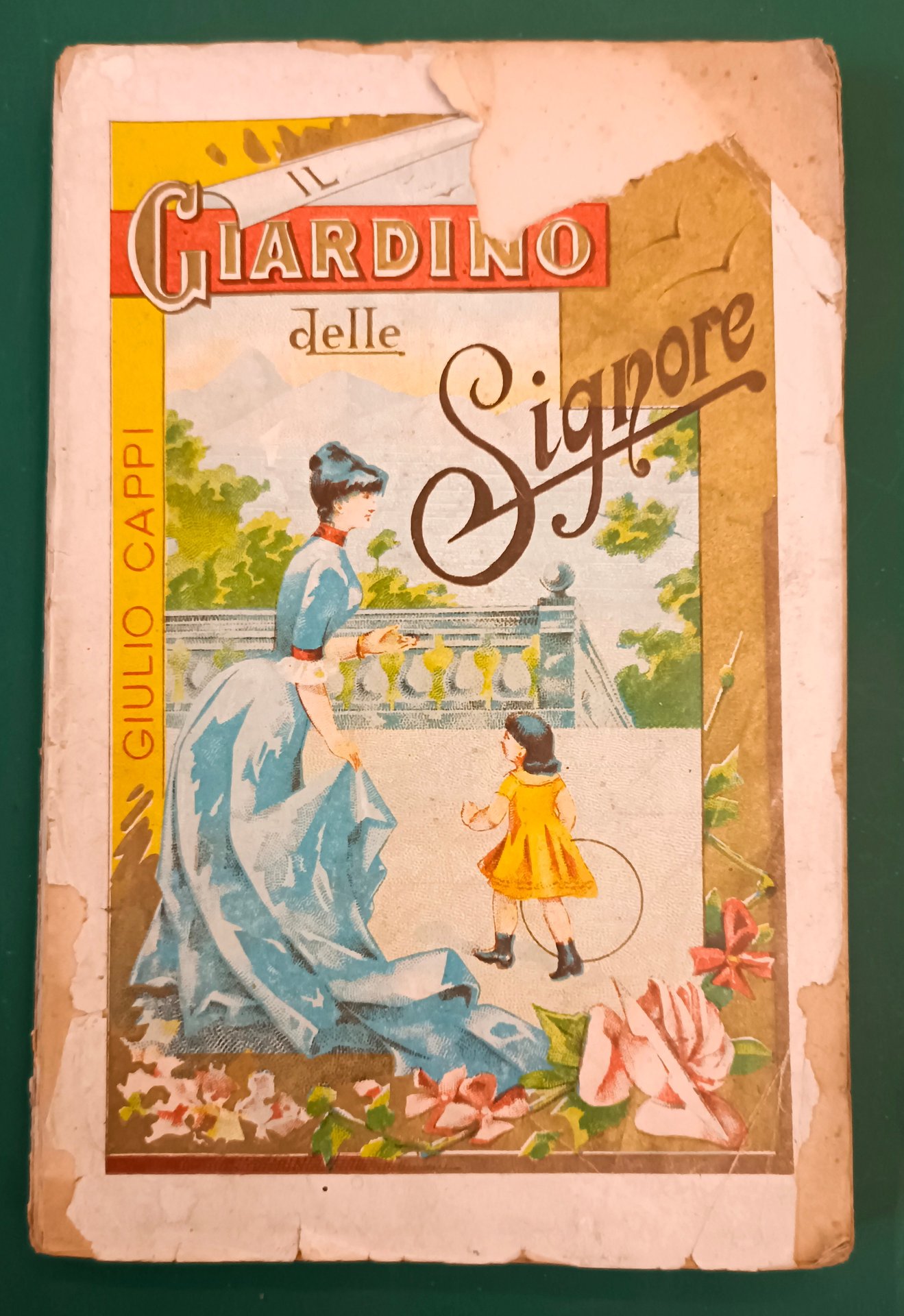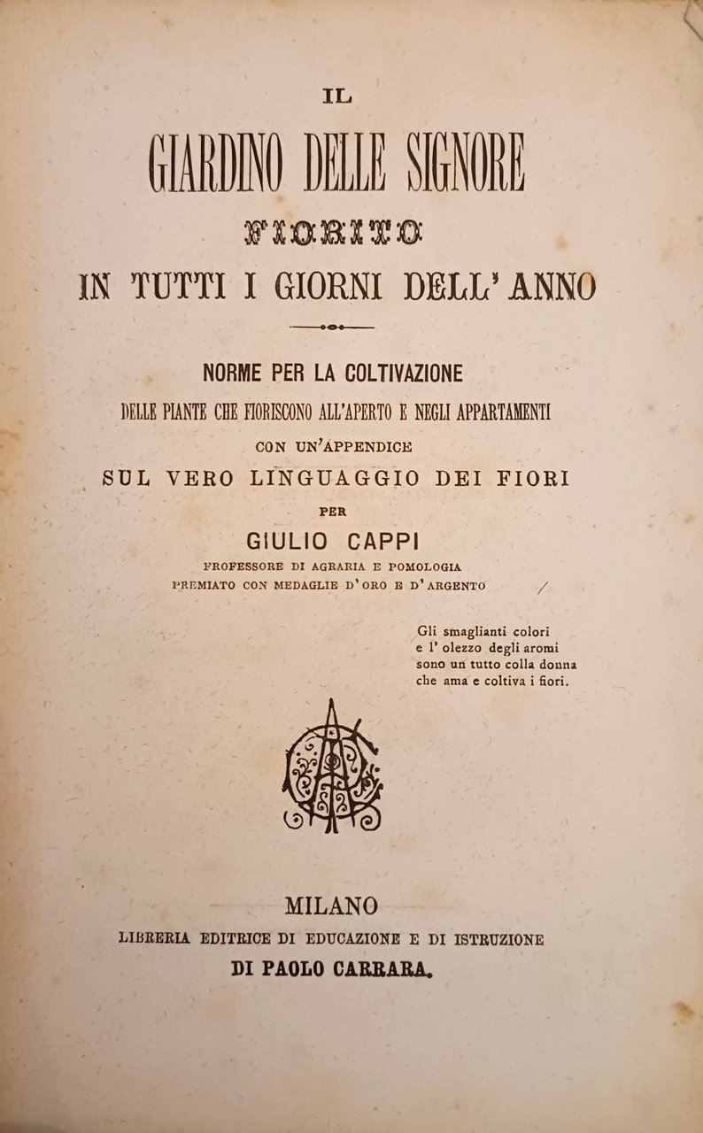Cappi Giulio - IL GIARDINO DELLE SIGNORE FIORITO IN TUTTI I GIORNI DELL'ANNO. Norme per la coltivazione delle piante che fioriscono all'aperto e negli appartamenti con un'appendice sul vero linguaggio dei fiori. Milano, Paolo Carrara, 1887. Brossura illustrata in cromolitografia. Cm 19. Pagine 190, (1). Illustrazioni fuori testo. Mancanze alla brossura.