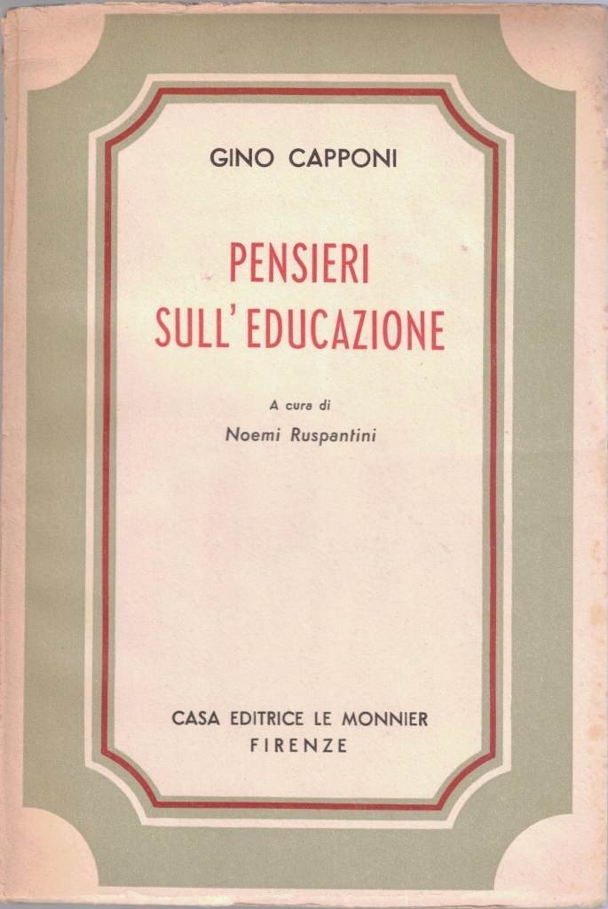 Gino Capponi, Pensieri sull’educazione, introduzione e commento di Noemi Ruspantini, Felice Le Monnier, Firenze 1954, pp. 149, in antiporta 1 c. di tav. f.t. ill. b.n. con ritratto dell’autore, cm 20, br. ed. Minima brunitura della carta, per il resto ottimo.