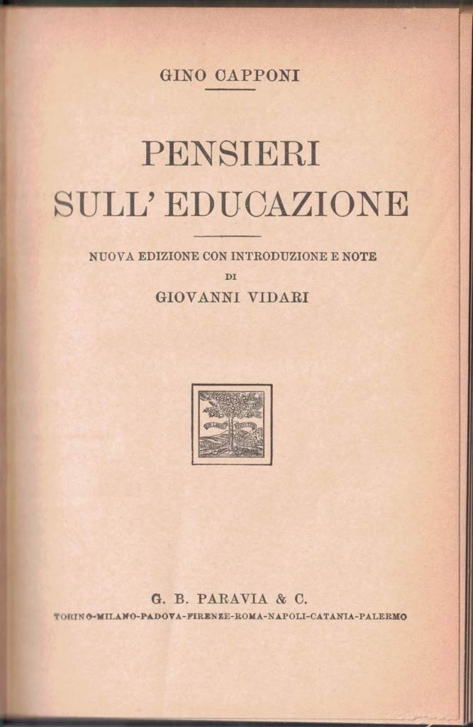 Gino Capponi, Pensieri sull’educazione. Nuova edizione con introduzione e note di Giovanni Vidari, G. B. Paravia e C., Torino 1936, quarta rist., pp. 114, cm 19, legatura in mezza tela verde con titoli manoscritti al dorso. Firma di appartenenza e data all’occhiello. Una piccolissima mancanza a prima carta di guardia e occhiello, un taglietto netto e senza mancanze a margine delle prime cinque carte di testo, lieve brunitura della carta, ma nel complesso volume molto ben conservato, perfetta la legatura.