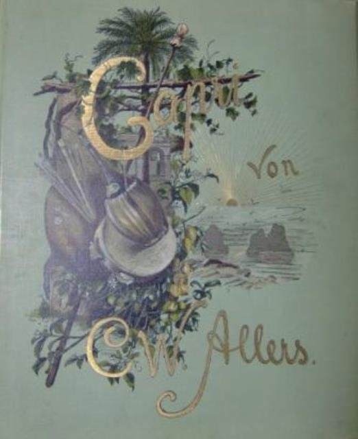 Munchen, Franz Hanfstaengl, s. d. (ma 1892 o 1894). In 4to grande, antip. con A. e titolo, front. con piccola ill., indice, pp. 6 n.n. (di E. von Wald – Zedtwitz), a seguire 60 ill. lit. in b/n o virate in verde, in marrone o in seppia, di cui molte a p. p., raffig. vedute, scorci di paesaggi e personaggi caratteristici della Capri ottocentesca, leg. in t. tela verde, ill. al piatto con i faraglioni sullo sfondo, Autore e titolo in oro, fogli di guardia in carta decorata, tagli in oro. Celebre figurato ottocentesco dedicato a Capri, con disegni riguardanti la vedutistica e la vita popolare. Christian Wilhelm Allers, noto illustratore e litografo tedesco, autore di piacevoli album litografici dedicati alle mete dei suoi viaggi (Interlaken, Grindelwald, il Wetterhorn, il Lago di Lucerna, Napoli e Capri). Nei suoi volumi, peraltro i più celebri, si rendono efficacemente l’atmosfera dei luoghi e le impressioni che potevano trarne i viaggiatori sul finire del diciannovesimo secolo, quando il viaggio era ancora un’avventura fortemente romantica e individuale: sono ritratte carrozze ferroviarie, piccole stazioni, grandi alberghi, locande, i passatempi dei turisti, i ristoranti e le “tables d’hotels”. Allers era innamorato di Capri e ivi possedeva una elegante villa a Punta Tragara. Impiegava gran parte del suo tempo a passeggiare con ammiratori, amici e signore, lavorando “en plein air” e disegnando ovunque ne avesse voglia o qualora qualcuno glielo chiedesse: lasciava schizzi e bozzetti sulle pareti degli alberghi, sulla pagine del registro viaggiatori, sulle pareti di osterie, caffè e barbieri. Particolarmente bello e ricercato questo volume dedicato a Capri. Esemplare un po' allentato ma in ottimo stato di conservazione.