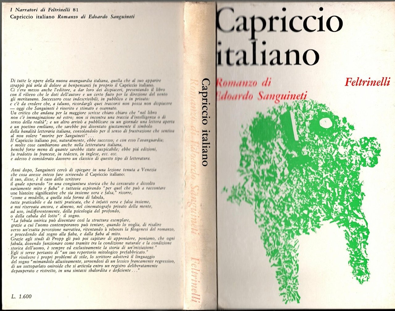 CAPRICCIO ITALIANO romanzo di Edoardo Sanguineti. Feltrinelli Editore, 1967 . 215 pagine. Copertina editoriale in brossura. Stato di conservazione: molto buono (pagine normalmente ingiallite) Capriccio italiano è il romanzo d’esordio di Edoardo Sanguineti, pubblicato originariamente nel 1963.
