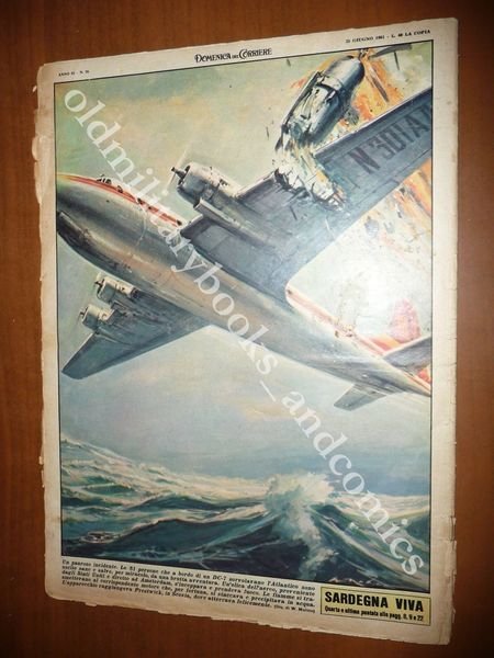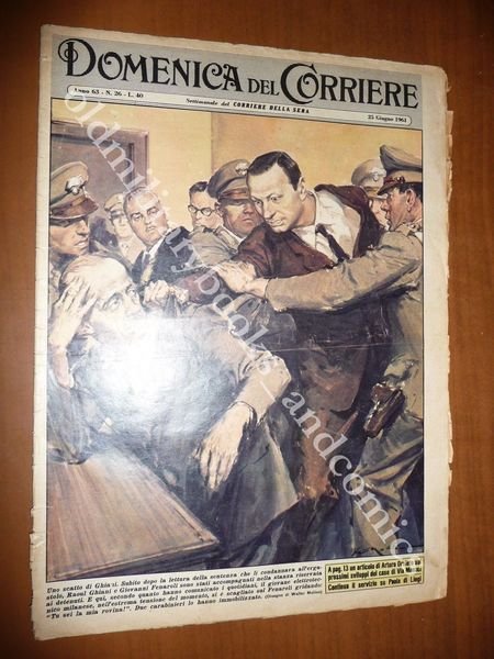 DESCRIZIONE: Domenica del Corriere, Milano, Anno 63 n. 26 (25 Giugno 1961). COPERTINA: "Raoul Ghiani si scaglia su Giovanni Fenaroli, due carabinieri lo immobilizzano" (dis. Walter Molino). RETRO: "Pauroso incidente aereo per un DC-7 sull'Atlantico" (dis. Walter Molino). La Domenica del Corriere è stato un popolare settimanale italiano fondato a Milano nel 1899 e chiuso nel 1989. Apparve per la prima volta nelle edicole l'8 gennaio 1899 come supplemento illustrato del Corriere della Sera. Stampata in grande formato (sul modello del domenicale La Tribuna illustrata), aveva 12 pagine e veniva distribuita gratis agli abbonati del Corriere, oppure si poteva acquistare in edicola per 10 centesimi. La prima e ultima di copertina erano sempre disegnate. Il Corriere si avvaleva di un giovane disegnatore, Achille Beltrame, allora sconosciuto, a cui veniva affidato in ogni numero il compito di rendere con la sua tavola il fatto più interessante della settimana. Dopo la sua morte nel 1945, fu sostituito da Walter Molino che, come il suo predecessore, firmò memorabili copertine. A differenza dei settimanali dell'epoca, la Domenica del Corriere diede ampio spazio alle fotografie e ai disegni, e questo fu uno dei motivi del suo successo. CONDIZIONI: Molto Buone. PESO / WEIGHT: 200 gr. without package