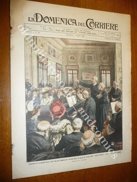 DESCRIZIONE: LA DOMENICA DEL CORRIERE 29 marzo 1908 n. 13 In copertina: Concerto di ex.artisti lirici in onore di Verdi nella "Casa di Riposo" per essi fondata da Verdi. Al retro: La crisi per la scarsità degli alloggi a Roma: una famiglia popolare attendata, con le suppellettili, in Piazza Colonna. CONDIZIONI DELL'OGGETTO: Discrete/Buone, senza sovraccoperta azzurrina, proveniente da rilegatura, con evidenti strappi e mancanze alla parte alta della rivista. PESO/WEIGHT: 43 g without package