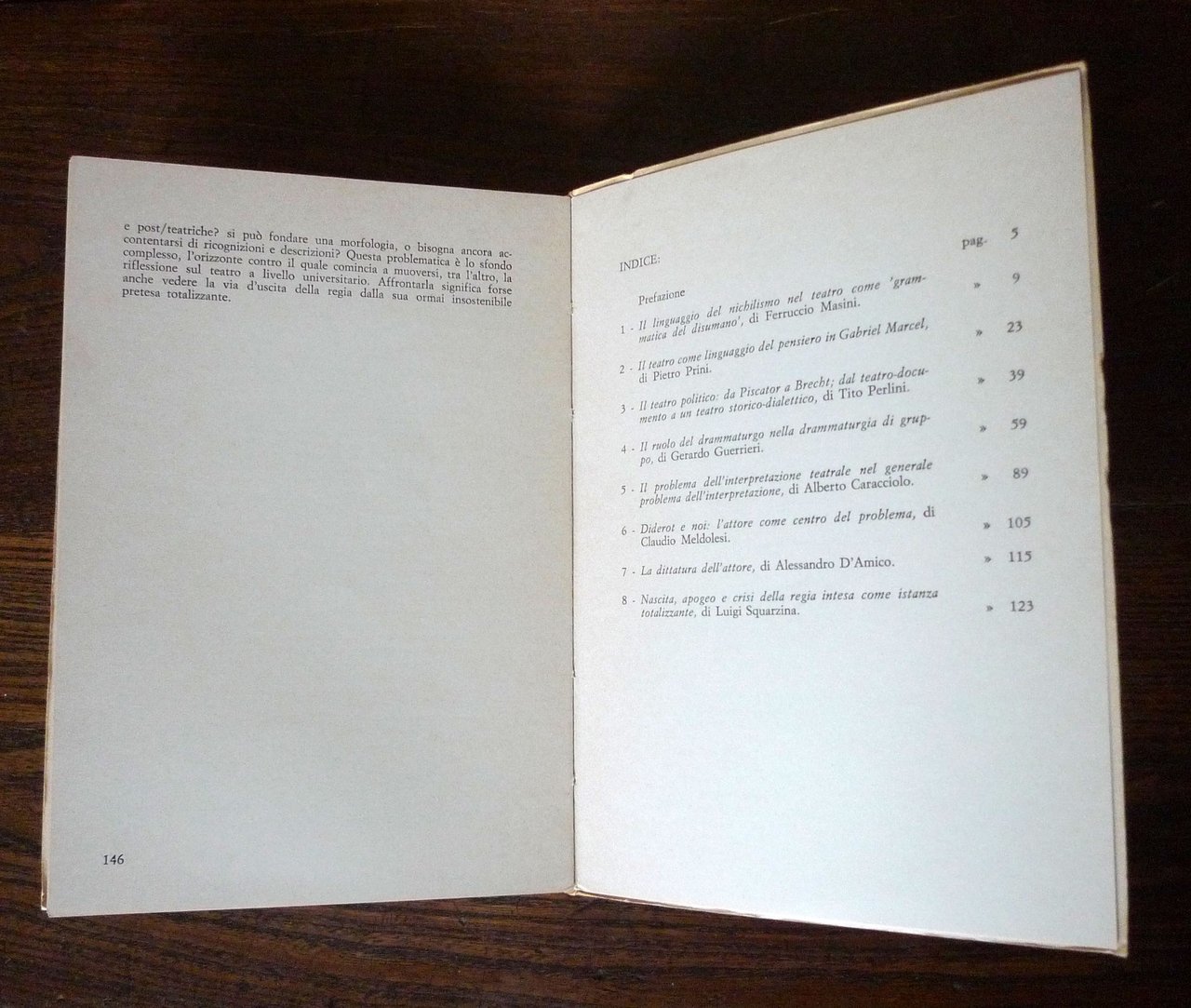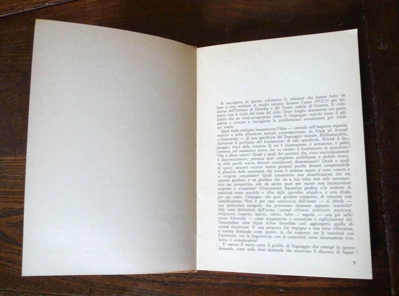 A cura di Alberto Caracciolo,PROBLEMI DEL LINGUAGGIO TEATRALE.Edizioni del Teatro Stabile di Genova, 1974,brossura, 21,5x15 cm., pp.146,COLLANA DEL TEATRO STABILE DI GENOVA / 21,peso: g.300cod.9932CONDIZIONI DEL LIBRO: molto buone,qualche sottolineatura a matitaIl vol. raccoglie i testi del I ciclo di seminari di studi teatrali promosso nella Stagione 1972/73 dall'Istituto di Filosofia della Facoltà di lettere e filosofia dell'Università di Genova e dal Teatro Stabile di Genova/ Museo Biblioteca dell'attore. Contiene: Il linguaggio del nichilismo nel teatro come "grammatica del disumano" / Ferruccio Masini. Il teatro come linguaggio e come pensiero in Gabriel Marcel / Pietro Prini. Il teatro politico da Piscator a Brecht: dal teatro documento a un teatro storico dialettico / Tito Perlini. Il ruolo del drammaturgo nella drammaturgia di gruppo / Gerardo Guerrieri. Il problema dell'interpretazione teatrale nel generale problema dell'interpretazione / Alberto Caracciolo. Diderot e noi: l'attore come centro del problema / Claudio Meldolesi. La dittatura dell'attore / Alessandro D'Amico. Nascita, apogeo e crisi della regia intesa come istanza totalizzante / Luigi Squarzina