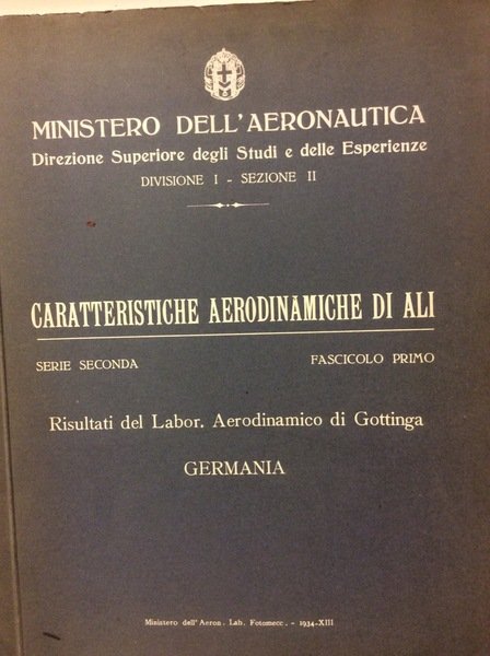 In-4, bross. orig., pp. (2),101,(3). Pubblicazione tecnica, basata esclusivamente su grafici. Il fascicolo contiene i Risultati del Laboratorio Aerodinamico di Gottinga, Germania. Ben conservato.