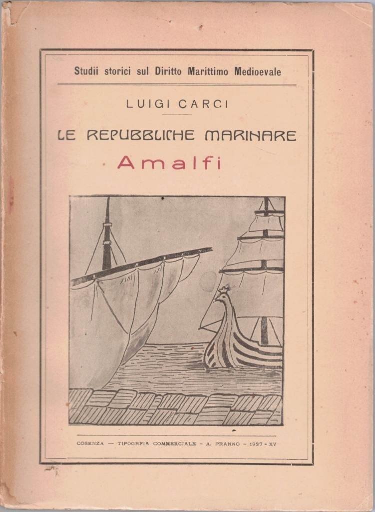 Luigi Carci, Le Repubbliche Marinare. Amalfi, Tip. Commerciale A. Pranno, Cosenza 1937, pp. 166, cm 23, br. ed. Collana Studi storici sul Diritto Marittimo Medioevale, vol. II. Al frontespizio, dicitura manoscritta: Omaggio dell’autore. Tracce d’uso alla brossura con una piccolissima mancanza alla copertina anteriore e uno strappetto senza mancanze alla copertina posteriore, minima brunitura della carta, per il resto e nel complesso buona copia. Ben tenuto l’interno.