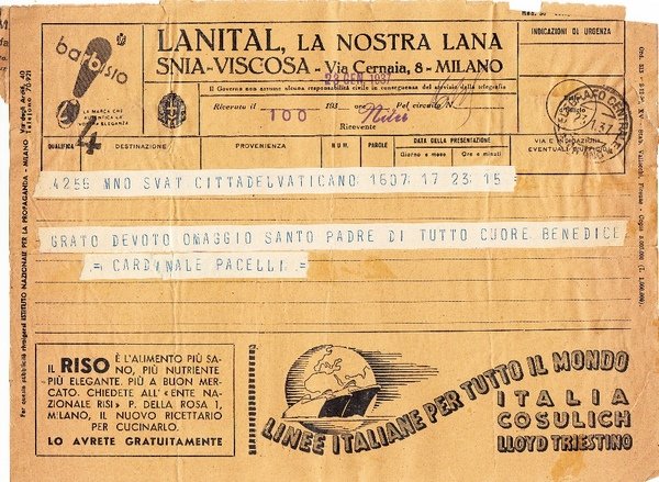 Note: telegramma del Cardinale Pacelli (Papa Pio XII) datato 23 Gennaio 1937.