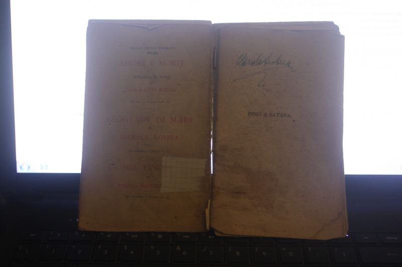 CODICE 2616, , Carducci, Giosuè. Satana e polemiche sataniche BOLOGNA 1879, , ESEMPLARE PRIVO DEL PIATTO FRONTALE SLEGATO E CON FOXIL E MACCHIE SPARSE ALL'INTERNO, Carducci, Giosuè. Satana e polemiche sataniche. XIII edizione con emendazioni. Bologna, Zanichelli, 1879., In-12°, pp. 74, brossura editoriale. solo piatto di fondo , , Nel 1863 pubblicò con lo pseudonimo di Enotrio Romano l'Inno a Satana che, pur ottenendo successo, fomentò vivaci polemiche, è questo un tributo alle conquiste della scienza e del progresso in genere.